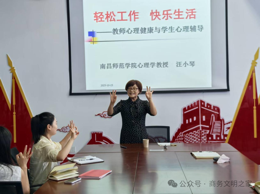 为提升教师的心理素养,促进师生的心理健康,2025年10月15日下午,商学院特别邀请了南昌师范学院的心理学教授汪小琴,举办了一场题为《轻松工作 快乐生活——教师心理健康与学生心理辅导》的专题讲座。商学院全体教职工以及其他对此感兴趣的教师参加了此次讲座。