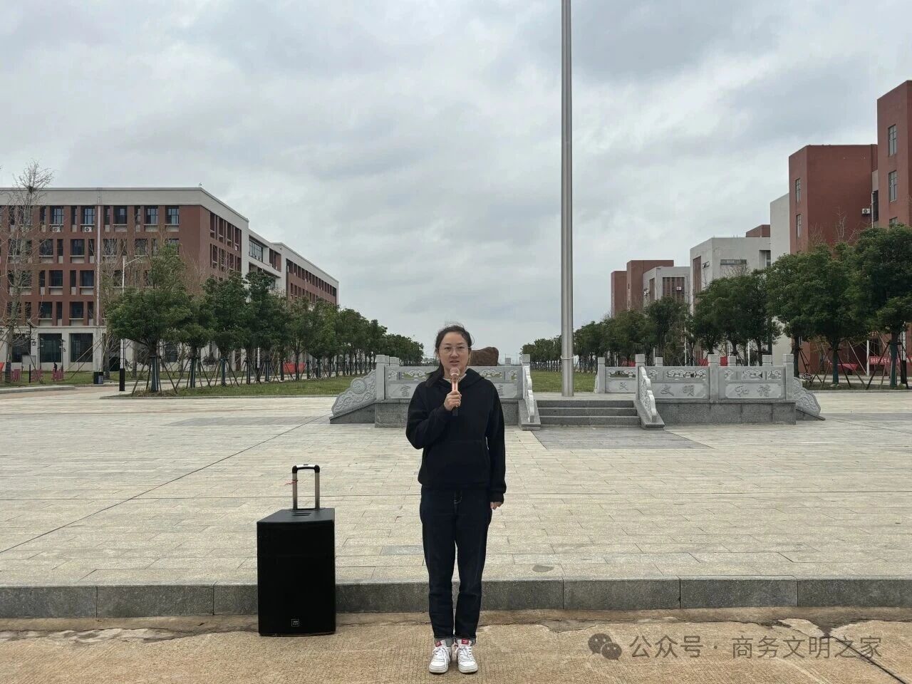 最后,商学院党总支书记程思梦对本次升旗仪式进行总结,她先赞扬了同学们展现出的钢铁意志,然后强调,坚定崇高的理想信念是青年立身之本、成才之基。她勉励全体同学,要自觉将个人理想融入国家和民族的事业中,做到志存高远与脚踏实地相结合。程思梦书记说到,大家要珍惜韶华,勤于学习,勇于实践,在不断砥砺品格、增长才干中,努力成长为可堪大用、能担重任的时代新人,为实现中华民族伟大复兴贡献青春力量。