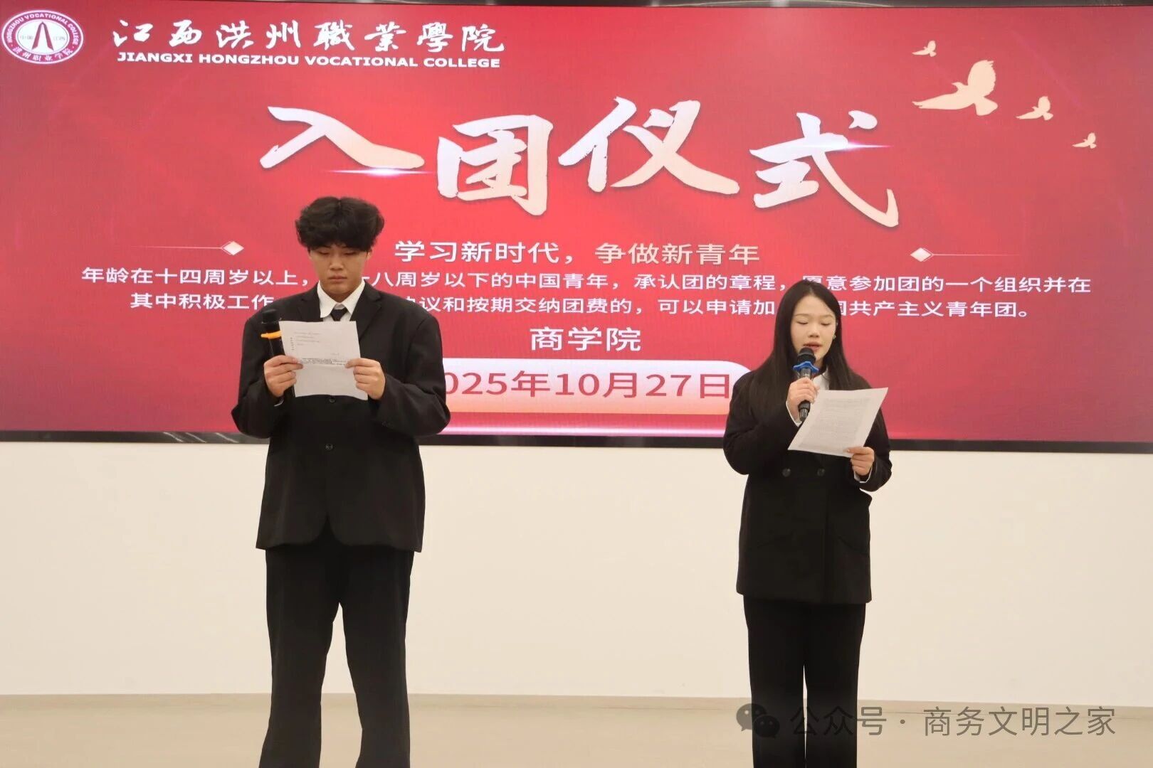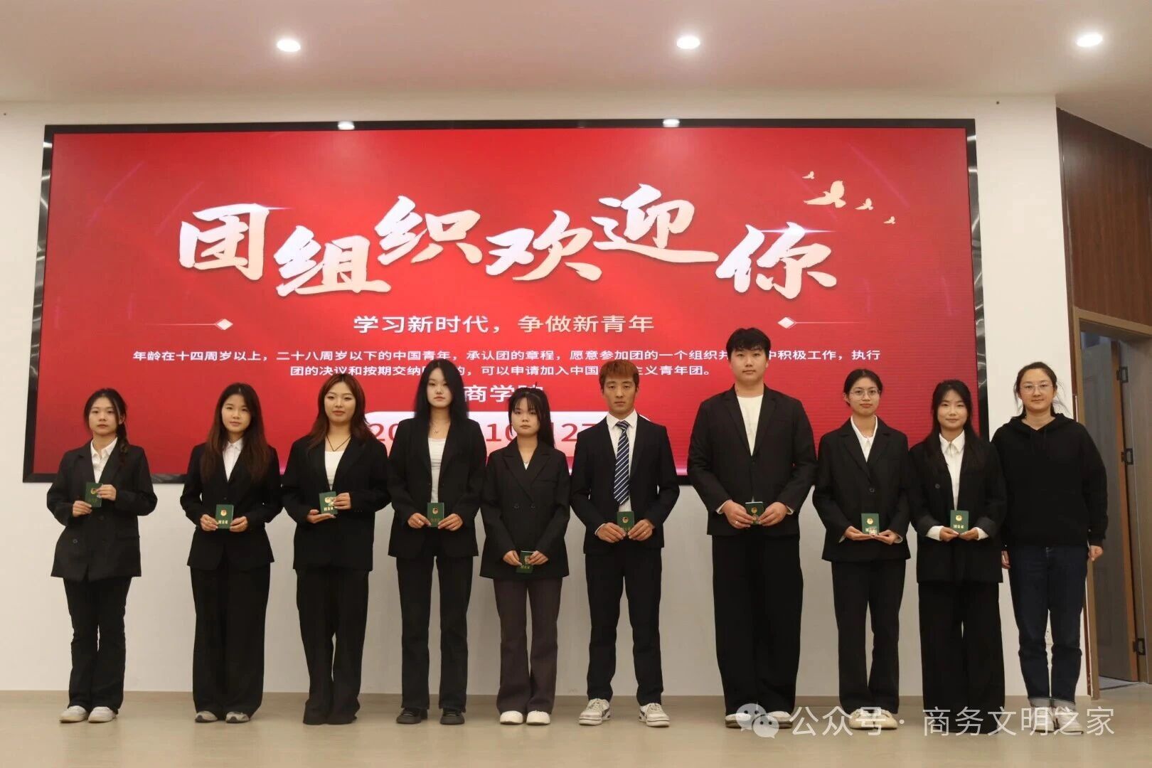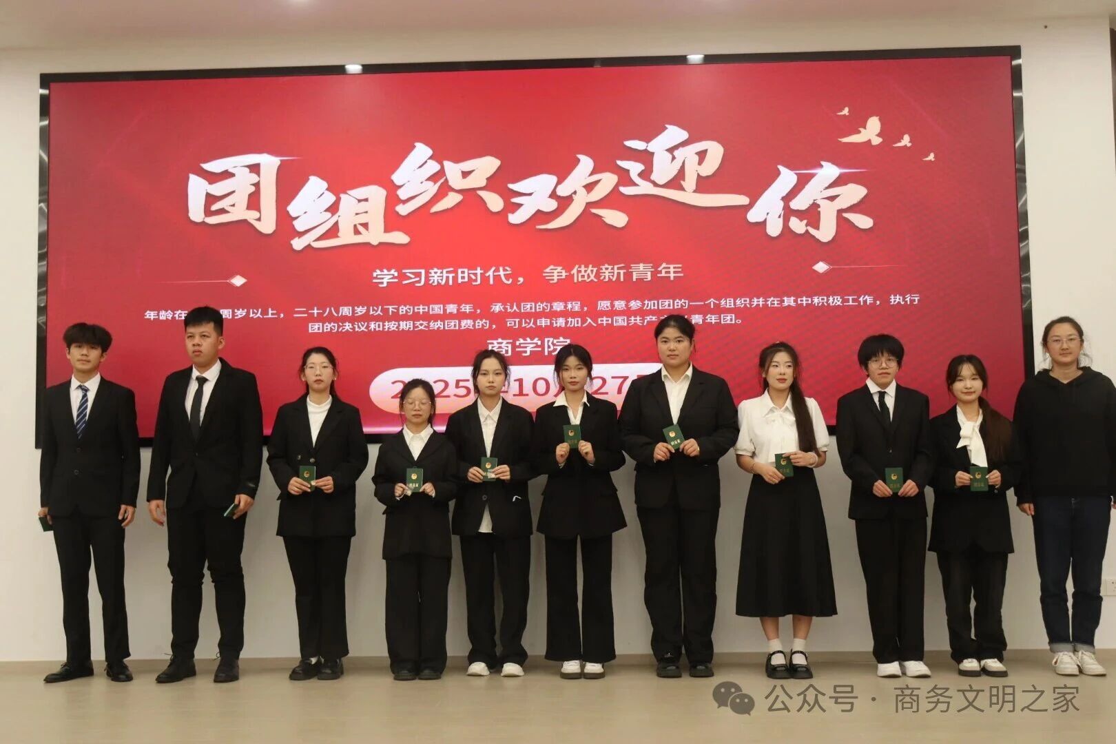 深入贯彻习近平总书记关于青年工作的重要思想,进一步夯实共青团基层组织建设根基,切实增强共青团组织的凝聚力与战斗力,推动团员先进性教育走深走实、入脑入心,于2025年10月27日商学院在举行6栋一楼圆厅教室举行“学习新时代,争做新青年” 新团员入团仪式。商学院党总支部书记程思梦、团总支书记李婷及辅导员老师邓建业、范恩妮以及新团员们出席了本次入团仪式,由徐超亿和聂楚欢主持。