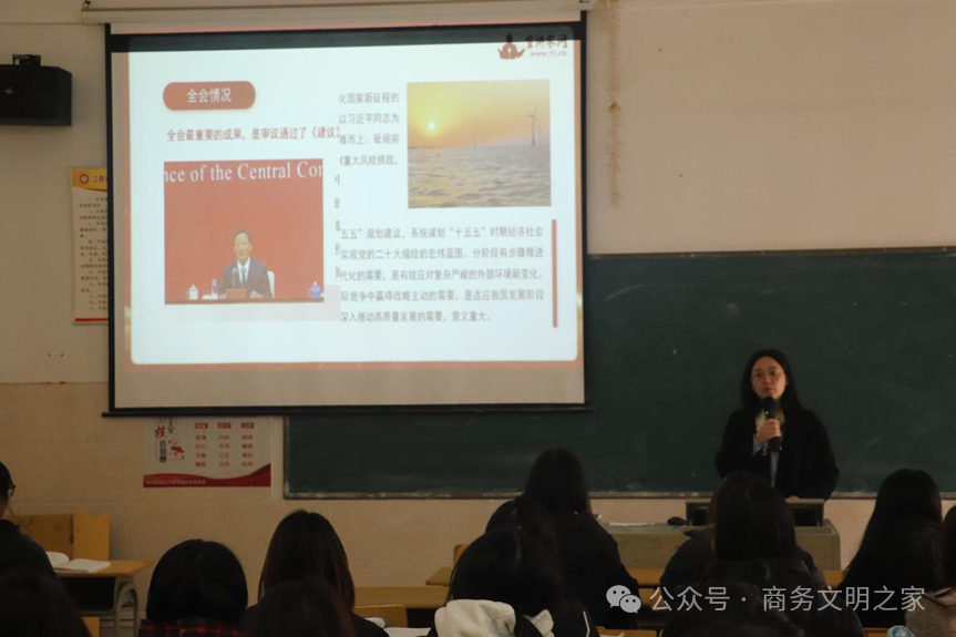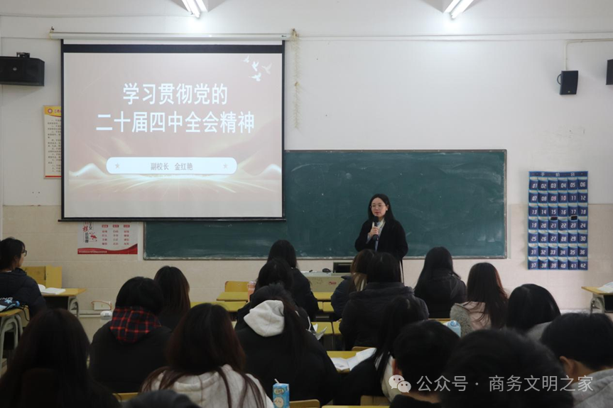 2025 年 12 月 5 日,江西洪州职业学院副校长金红艳走进课堂,以《学习贯彻党的二十届四中全会精神》为题,为商学院 2024 级大数据与会计 1 班的学生们带来了一堂思政课。课堂上座无虚席,同学们专注聆听、积极互动,在理论滋养与思想碰撞中明晰时代责任,坚定奋斗方向。