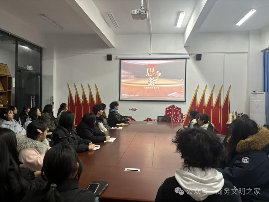 2025年12月16日晚7点,在新实训楼4-3,商学院组织入党积极分子和入团积极分子,观看中共江西省委教育工委、江西省教育厅监制,省委教育工委宣传部(省教育厅社政处)、江西都市频道联合出品的大型思政专题节目《思享荟》第52期——《工业废墟变绿色典范》。