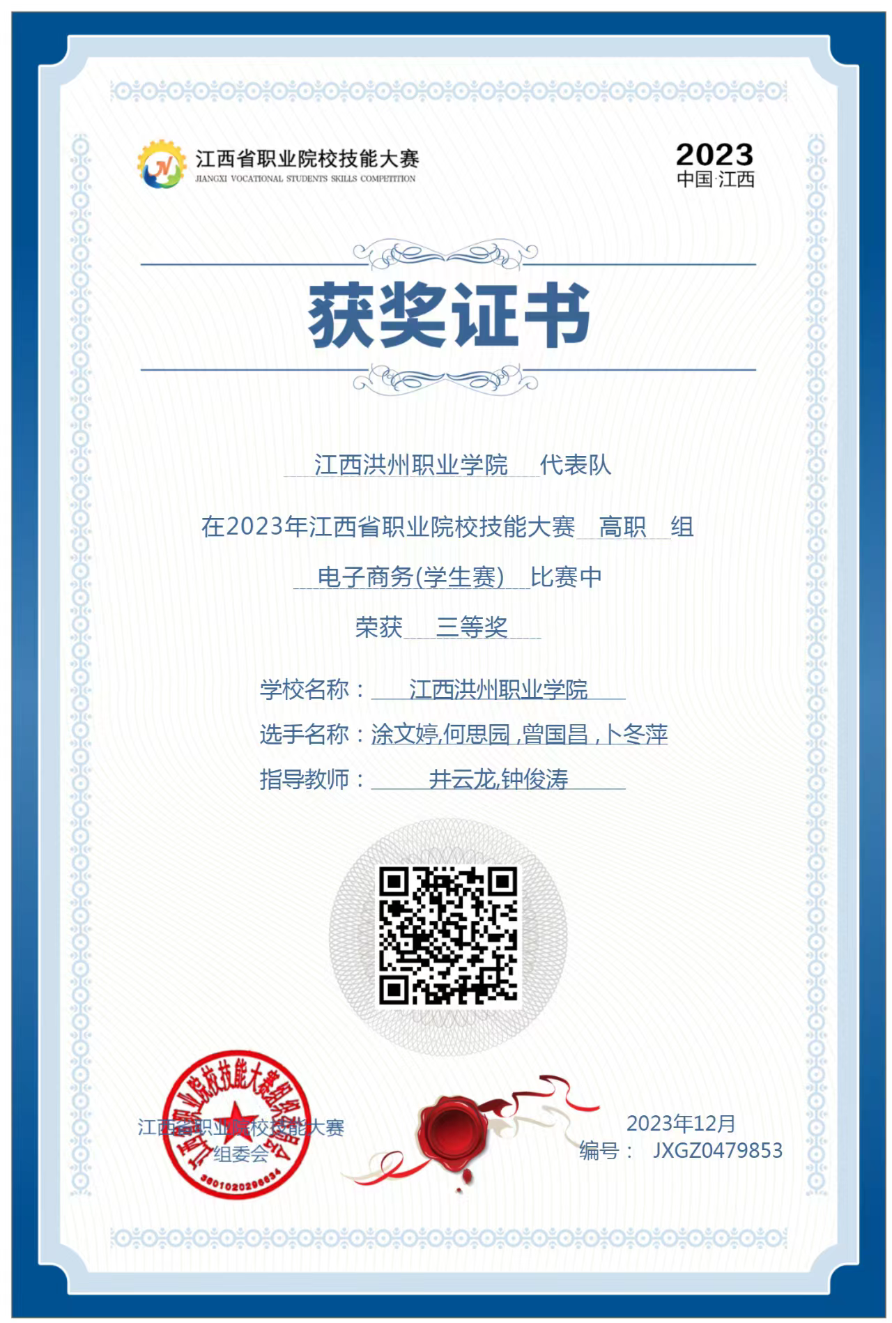 2023年11月18-19日,由省教育厅主办的2023年江西省职业院校技能大赛(高职组)电子商务竞赛在南昌顺利落下帷幕。我校商学院积极组织电子商务专业学生参赛,由涂文婷、何思园、曾国昌、卜冬萍四名同学组成的学生团队,在井云龙、钟俊涛两位指导老师的带领下,经过两天紧张激烈的比拼,最终取得了大赛电子商务技能赛项团体三等奖的好成绩。