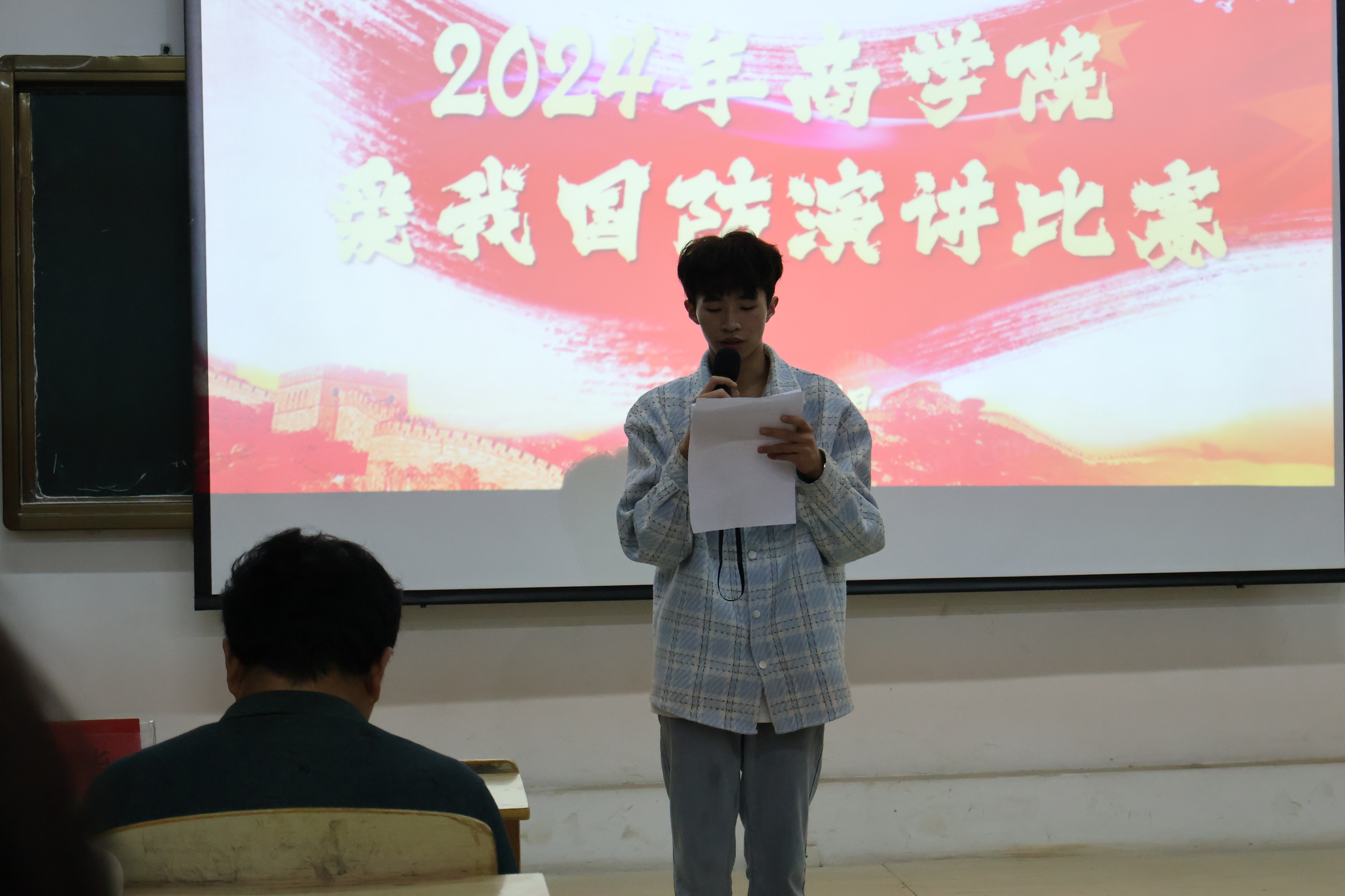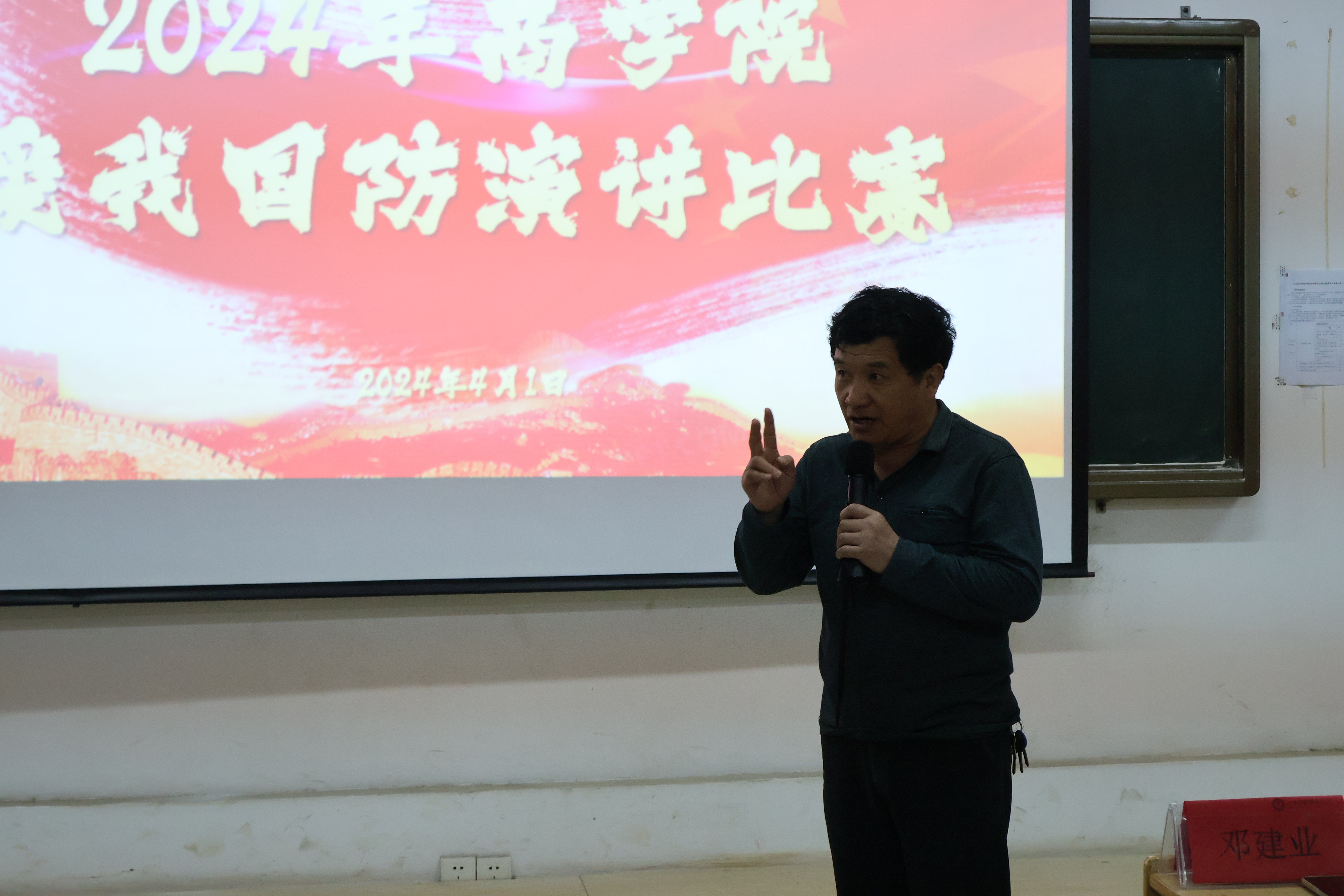 为深入学习贯彻习近平强军思想,全面贯彻党的二十大精神,推动新时代全民国防教育深入普及,不断丰富学校国防教育实践载体,增强青少年国防观念和国防素养,助力我校思想政治教育一体化建设。2024年4月1日星期一,我院在教学楼一栋201多媒体教室开展爱我国防演讲比赛,共有14名选手参与比赛,出席本次比赛的嘉宾有:商学院党支部书记杨旭华,学工办副主任李婷,辅导员黄灿烂、万丐、邓建业共5人。
