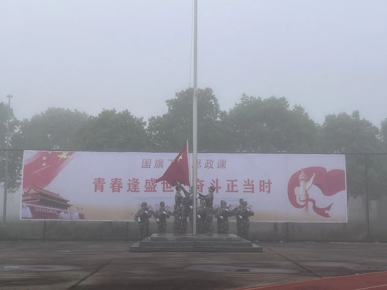 清晨伴随着蒙蒙升旗仪式正式开始,红旗招展。昂首挺胸、英姿飒爽的国旗护卫队以饱满的精神状态,迈着铿锵有力的步伐,庄严地护送国旗至升旗台。伴随着《义勇军进行曲》激昂的旋律,五星红旗冉冉升起、迎风飘扬。在场全体师生庄严肃立,向国旗行注目礼,用雄壮的国歌声抒发着爱党爱国爱校情怀。