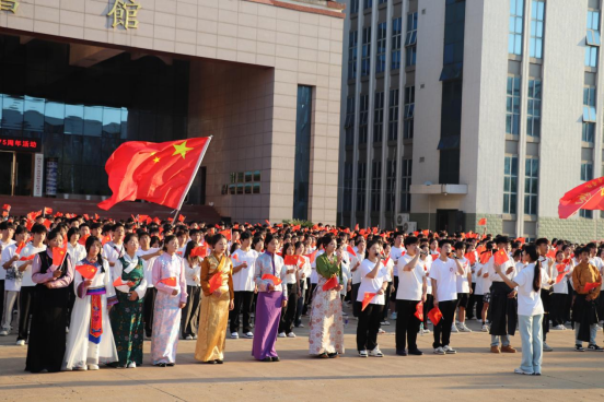 青春在国旗下熠熠生辉。随后,由商学院少数民族学生在前带头领唱,全体师生挥动手中的国旗,齐声合唱《歌唱祖国》,用歌声祝福祖国繁荣昌盛。同时,一部分同学身着红衣,在广场上摆出亮眼的“中国”二字,以青春的名义向伟大祖国深情告白。