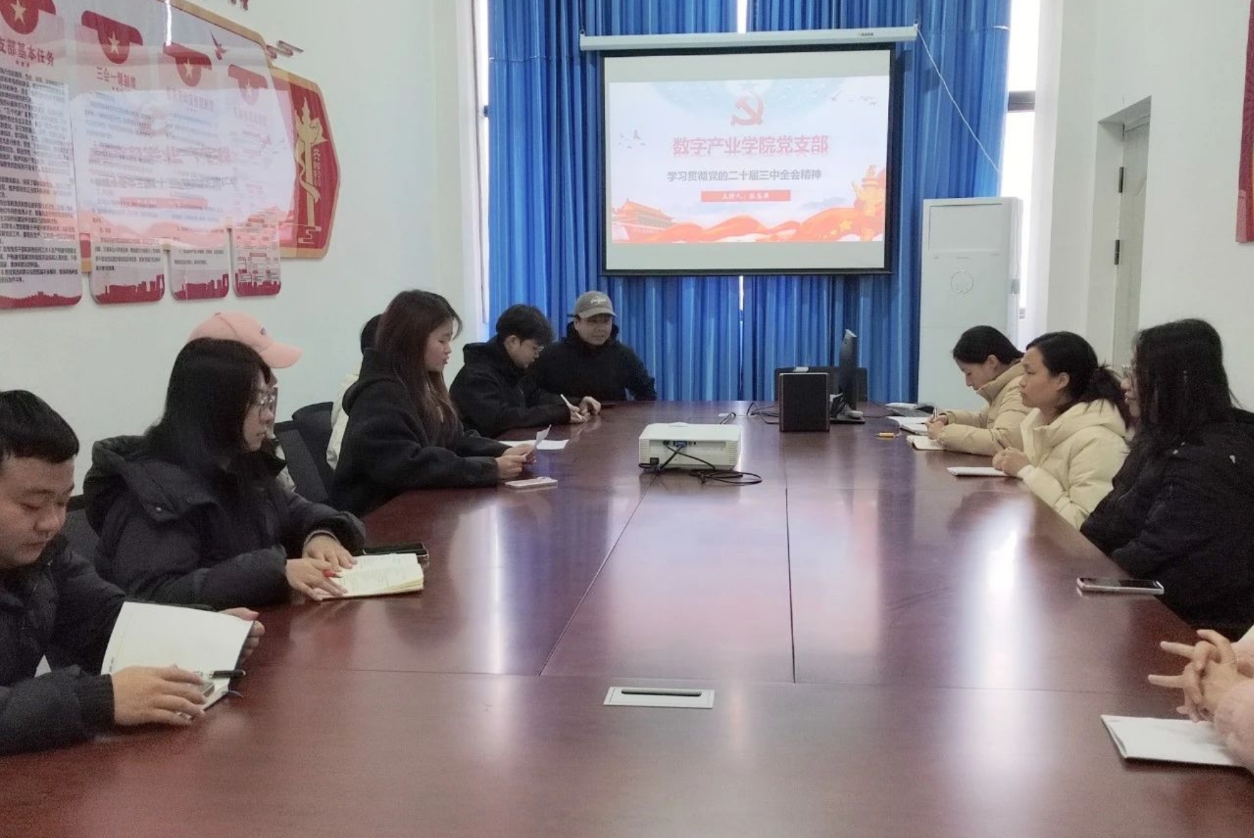 2024年12月25日下午,数字产业学院党支部在党员活动室开展了学习贯彻党的二十届三中全会精神专题辅导课程,对培训课程内容开展集中学习和交流研讨。此次会议由数字产业学院党支部组织委员林志颖主持,全体党员与入党积极分子参加会议。