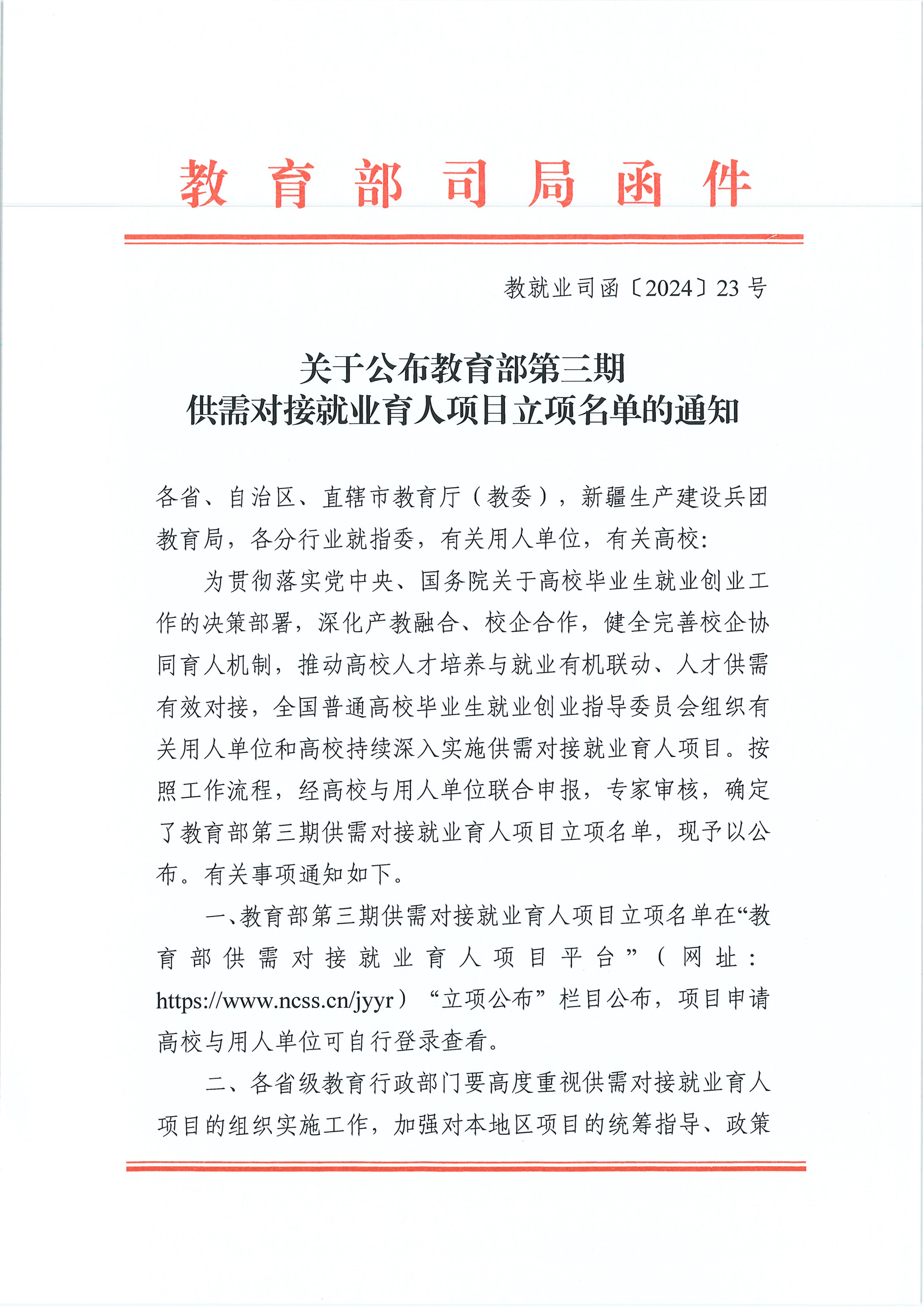 近日,教育部高校学生司(高校毕业生就业服务司)发布《关于公布教育部第三期供需对接就业育人项目立项名单的通知》(教就业司函〔2024〕23号),数字产业学院喜获教育部“供需对接就业育人项目”3项。