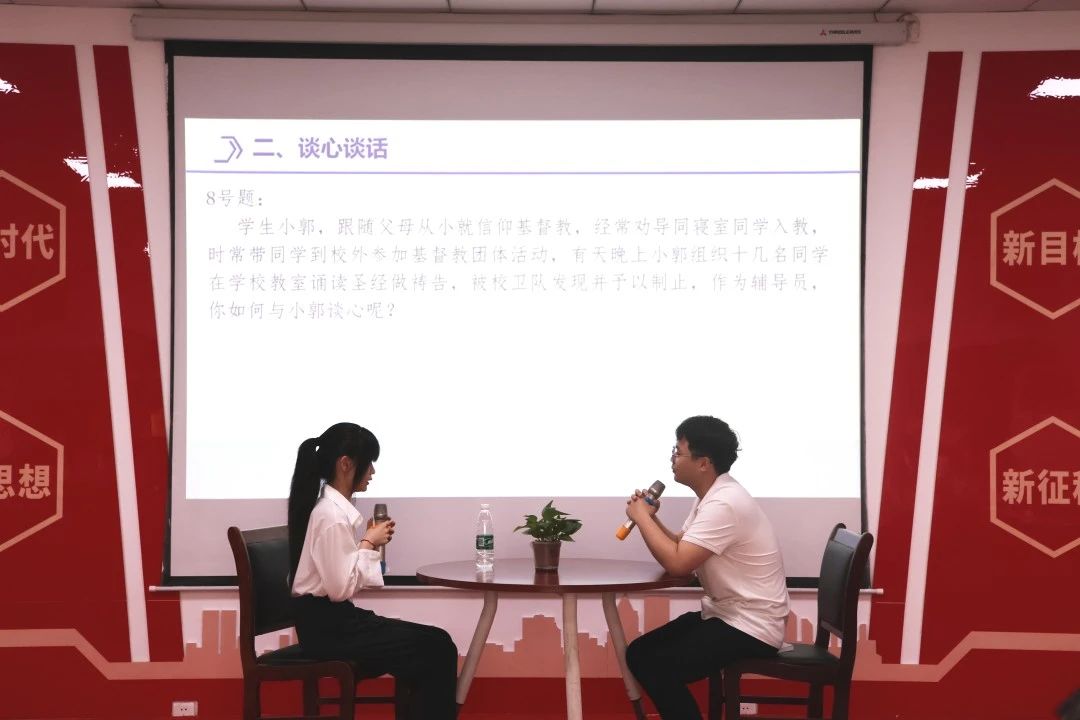 面对学生在学习、生活、情感等个人成长成才过程中的各种困惑与问题,选手们在“谈心谈话”环节循循善诱,细致入微,不仅展示了他们对学生的真挚关怀,更凸显了他们在学生思想政治工作中的专业素养和实践能力。