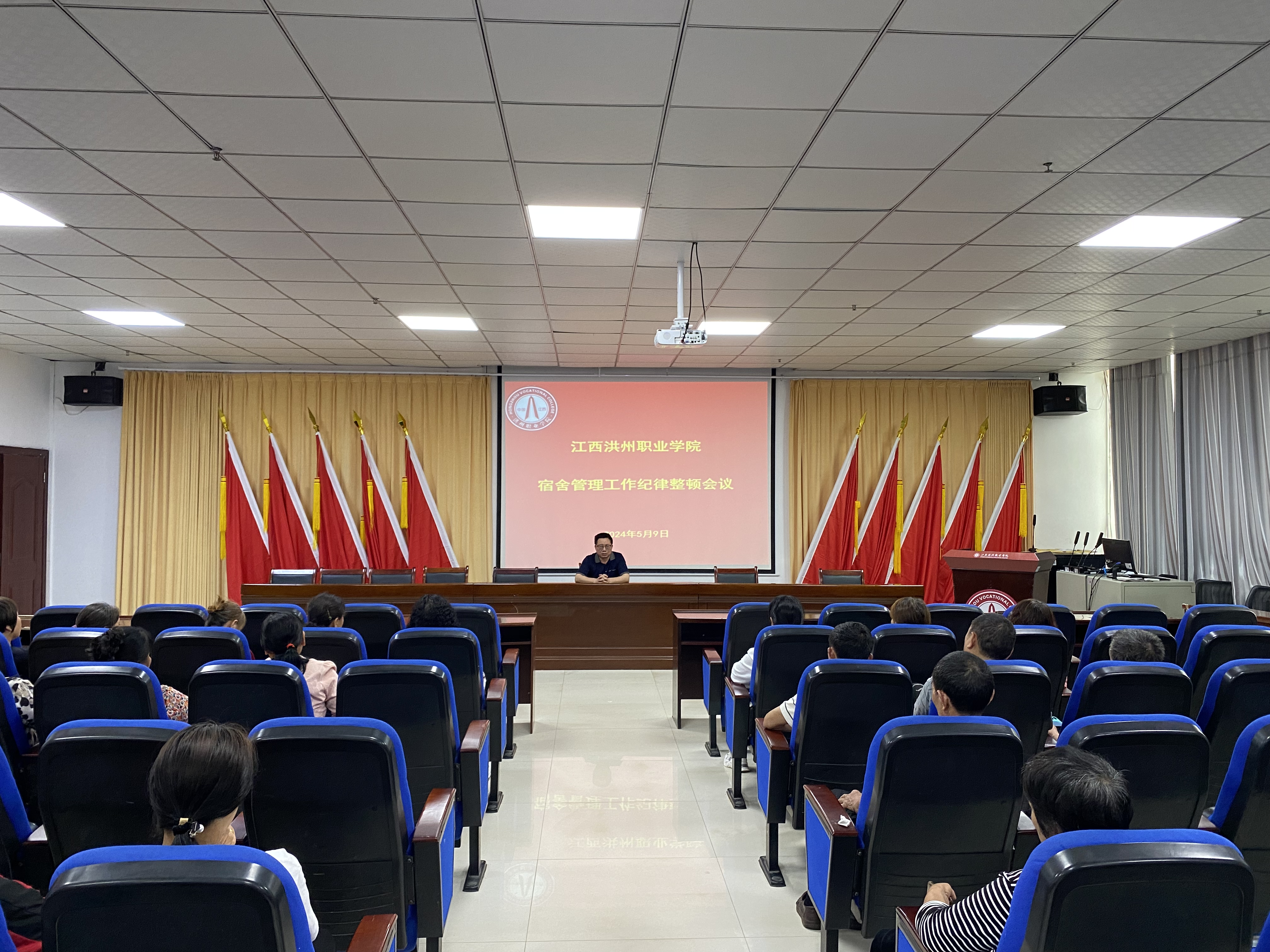 为加强和改进宿管工作作风,提升宿舍管理工作水平,5月9日,学校在图书馆一楼报告厅召开宿舍管理工作纪律整顿会议,学生工作处处长易桂林出席并主持会议,全体宿管员和公寓管理中心工作人员参加。