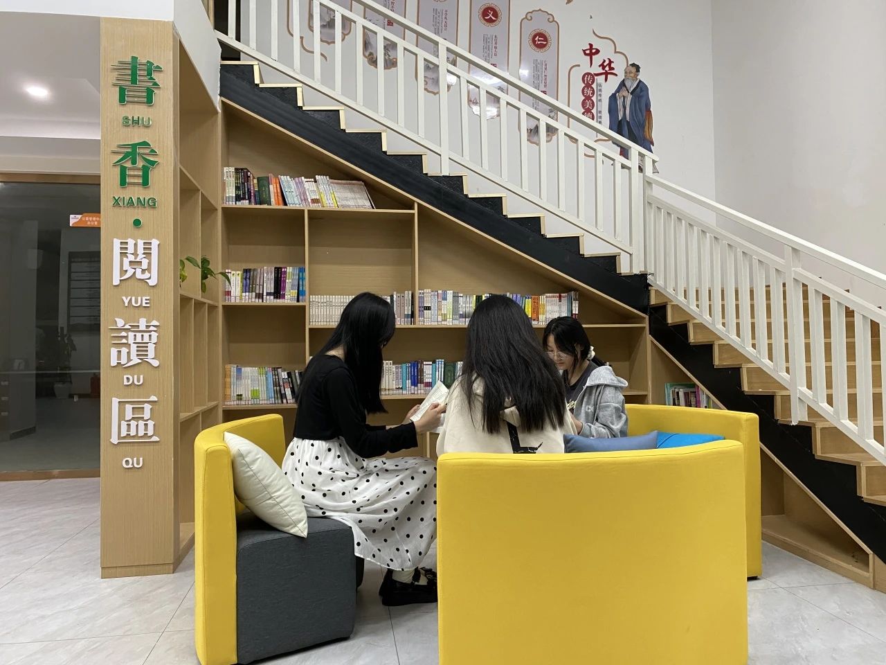 舒适的座位,灯火明亮开放式的阅读环境,方便学生们自拿自看,着力激发学生们的阅读兴趣