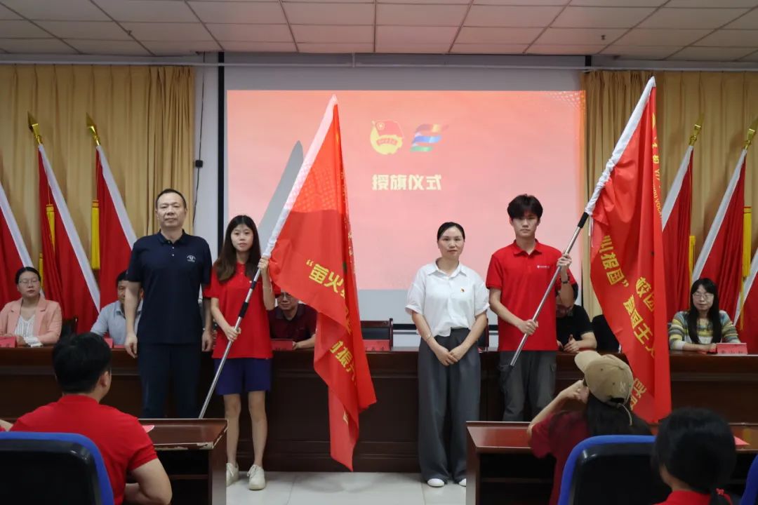随后进行了授旗仪式。党委书记程春清、纪委书记熊巧玲以及各学院党支部(副)书记为实践团队授旗。