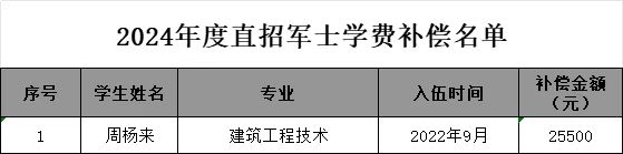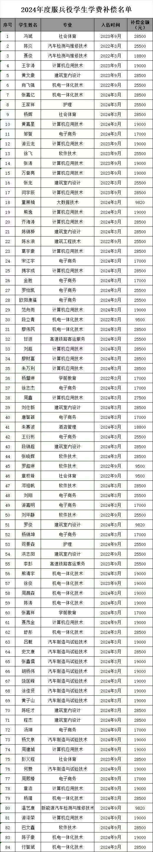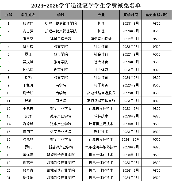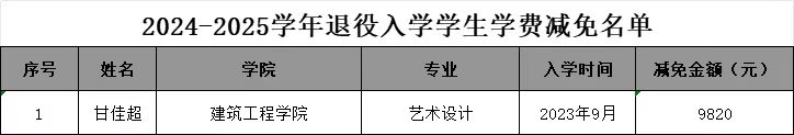 根据《江西省财政厅 江西省教育厅 江西省人力资源和社会保障厅 江西省退役军人事务厅 江西省人民政府征兵办公室关于印发<江西省学生资助资金管理办法>的通知》(赣财教〔2023〕2号)等文件规定,学校学生资助中心对2024年度符合服兵役资助条件学生的申报材料进行了认真审核,并按照要求完成国家教育资助系统信息录入、材料报送等工作。其中申请服兵役学费补偿、直招军士学费补偿的,将于近期到账,请注意查收;申请退役复学、退役入学学费减免的,财务处将分学年依次处理(详细名单如下)。