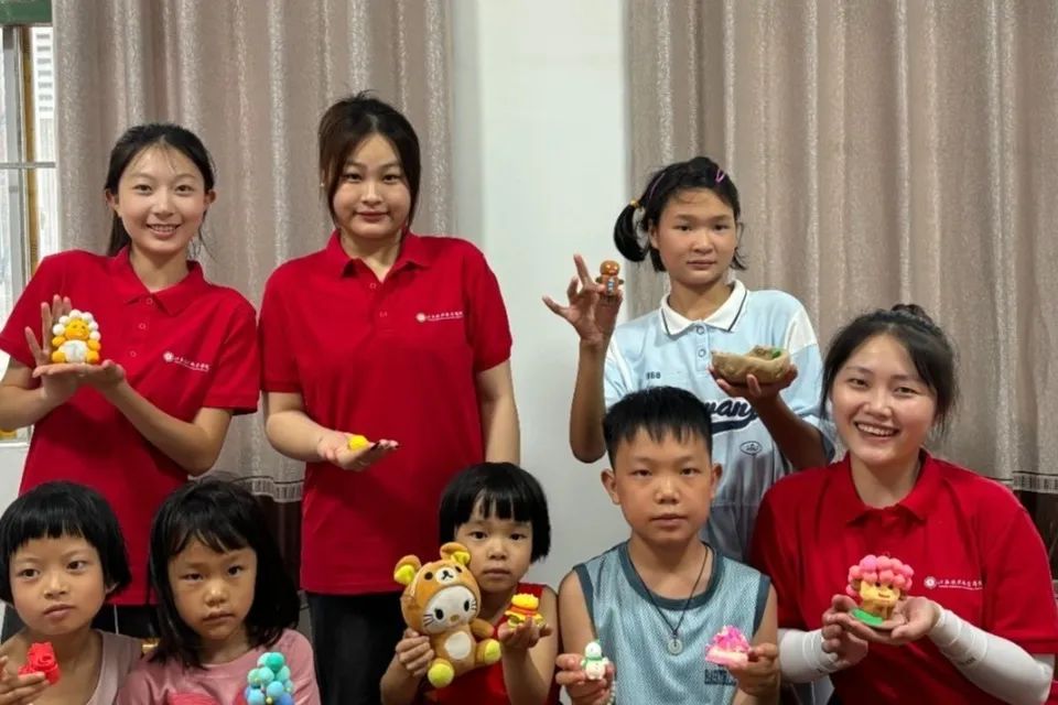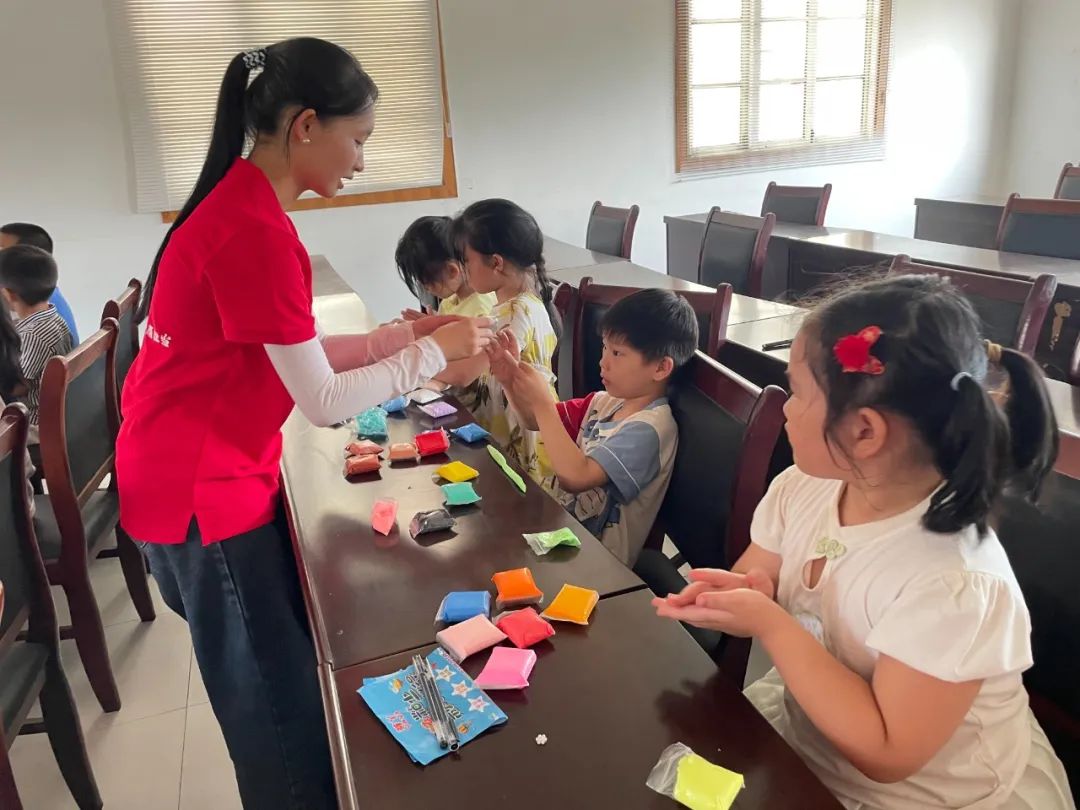 实践队员在曹山村开展“多彩黏土•萌趣童年”儿童手工黏土活动,不仅培养儿童动手能力和创造力,同时促进社区儿童之间的交流与合作。成员们将准备好的粘土分发给小朋友,五颜六色的粘土瞬间吸引了小朋友们的目光。在志愿者的耐心指导下,小朋友们迫不及待地动起手来。她们用小手轻轻揉捏着粘土,让其逐渐变得柔软而富有弹性。