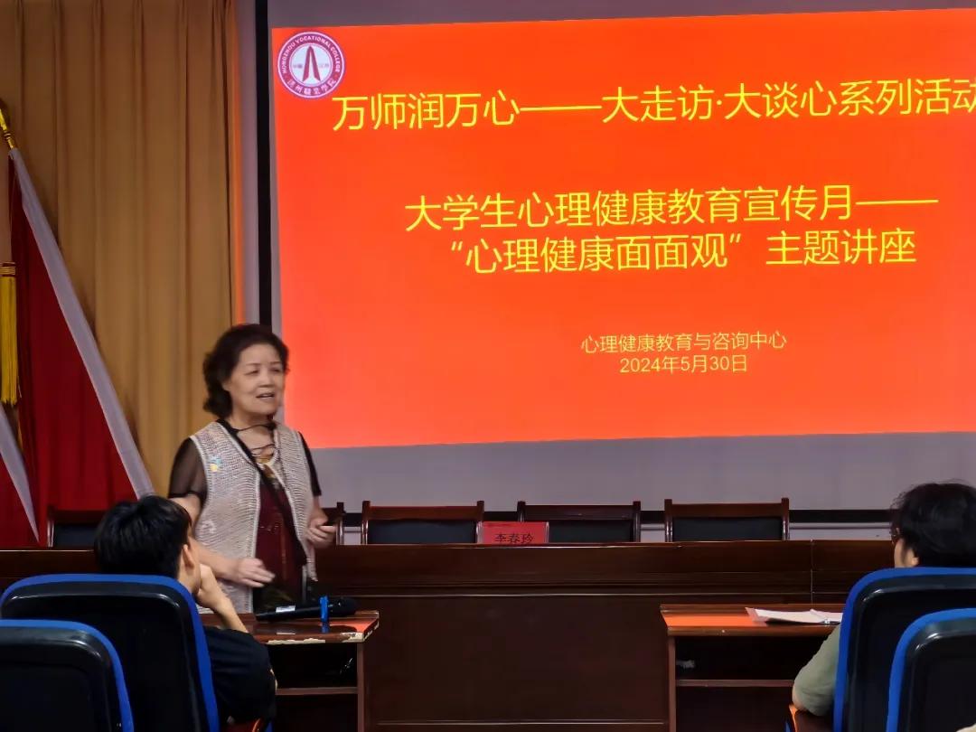 为深入学习贯彻习近平总书记关于学生心理健康工作的重要指示批示精神。全面落实《关于组织开展2024年全省大学生“5·25”心理健康教育系列活动的通知》《关于印发<全省大中小学心理健康教育“万师润万心·大走访大谈心”活动方案>的通知》,江西洪州职业学院一站式学生社区服务中心“暖心工作室”邀请心理健康教育与咨询中心顾问李春玲老师,为师生开展“大学生心理健康面面观”心理健康知识讲座,心理委员、心理联络员等学生代表、辅导员、学团人员近200名师生到场聆听。