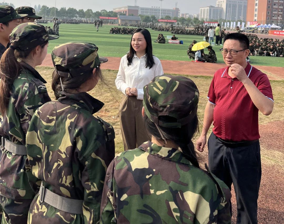 在训练场上,熊巧玲认真观看了同学们的列队行进,军姿训练等。易桂林与参训学生进行了亲切交流,详细询问了同学们的训练感受、生活状况及遇到的困难,鼓励大家要勇于克服困难,坚持到底,将军训中养成的良好习惯和坚强意志带入到今后的学习和生活中去。一位新生激动地说:“虽然军训很辛苦,但是我们一定会坚持下去,不辜负校领导和教官们的期望。”熊巧玲对教官们严谨的作风、专业的训练、辛勤的付出表示衷心的感谢,对同学们展现出的良好的精神风貌和军训成果给予了高度评价。她强调军训不仅是增强学生体质、磨练意志品质的重要途径,更是培养同学们爱国情怀、集体荣誉感和纪律观念的关键环节。她要求新生辅导员要密切关注新生的思想动态和实际需求,及时解决他们在军训及日常生活中的困难,确保军训工作与学生管理工作无缝衔接,为新生营造一个和谐、积极、向上的成长环境。