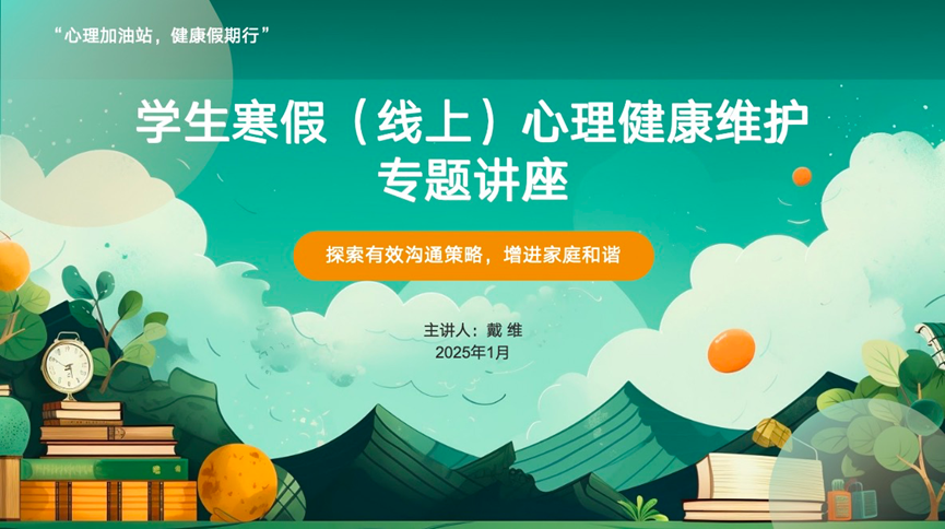 为切实帮助学校学生以积极健康的心态度过假期生活。2025年1月24日下午,学生工作处心理健康教育与咨询中心组织开展了”心理加油站,健康假期行“特别活动:“学生寒假(线上)心理健康维护”专题讲座。讲座由心理中心专职教师戴维主讲,在校学生、家长、辅导员(班主任)、学团人员在线参与。