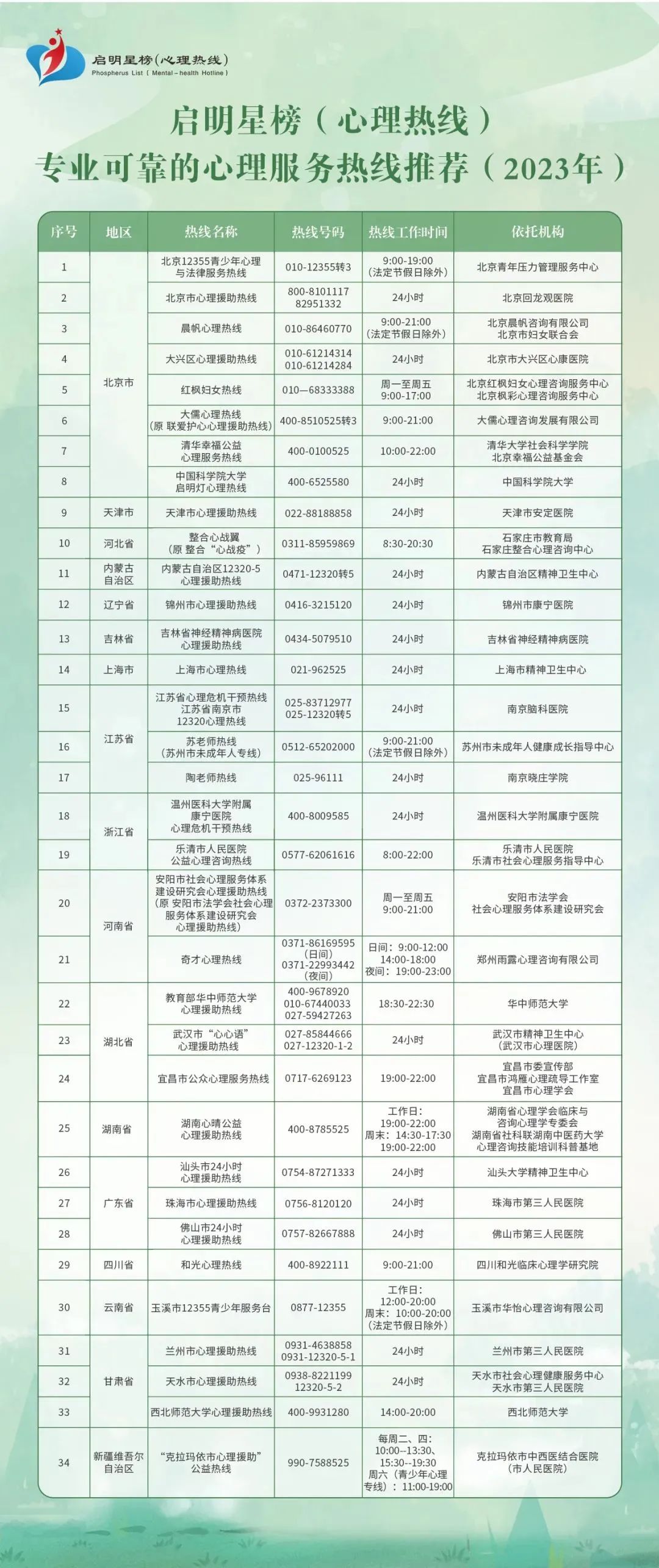 尊敬的老师、亲爱的同学们: 国庆假期期间,心理健康教育与咨询中心将持续为我校师生提供线上心理咨询服务,帮助师生以平和的心理状态度过假日。同时,心理中心为大家整理了公益心理热线的相关资源,方便师生及时获得心理咨询服务。