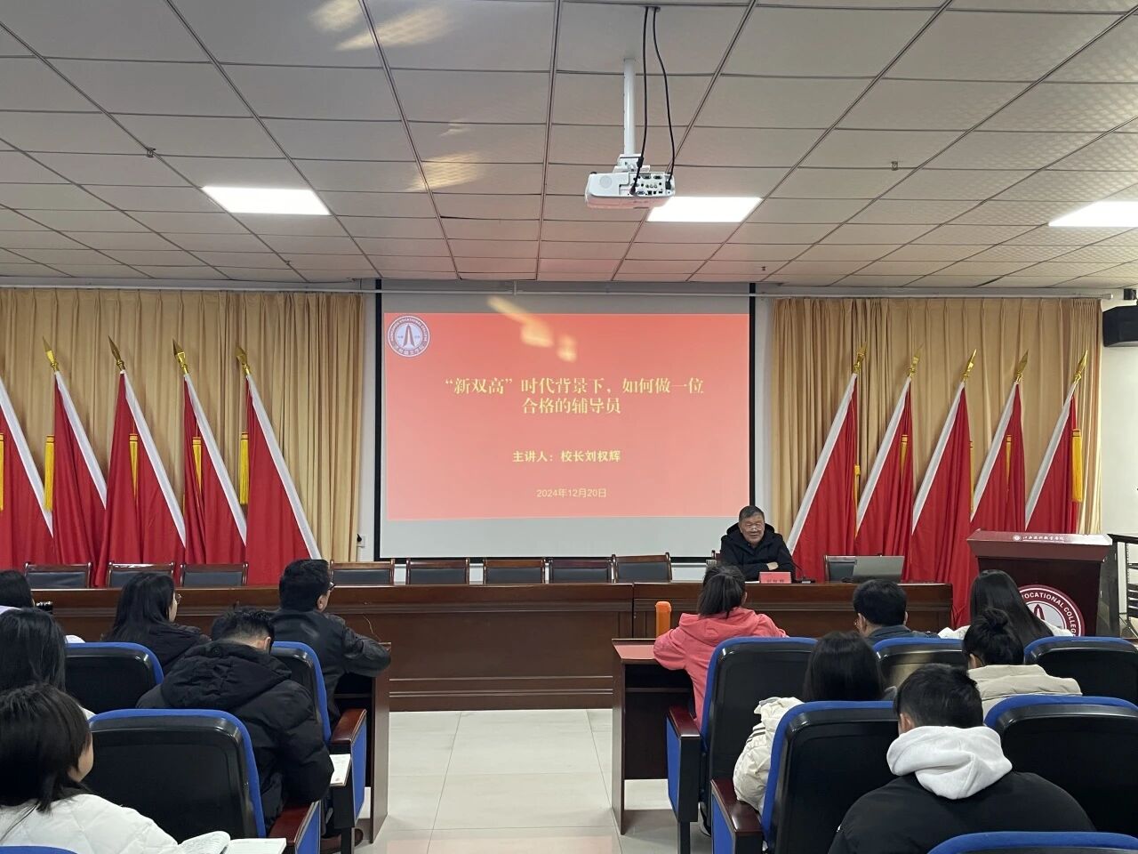 校长刘权辉以《“新双高”时代背景下,如何做一位合格的辅导员》为题开展辅导员业务培训。他详细解读了“双高”的含义,结合教育部颁布的《普通高等学校辅导员队伍建设规定》教育辅导员们如何履行职责,做好学生管理工作。