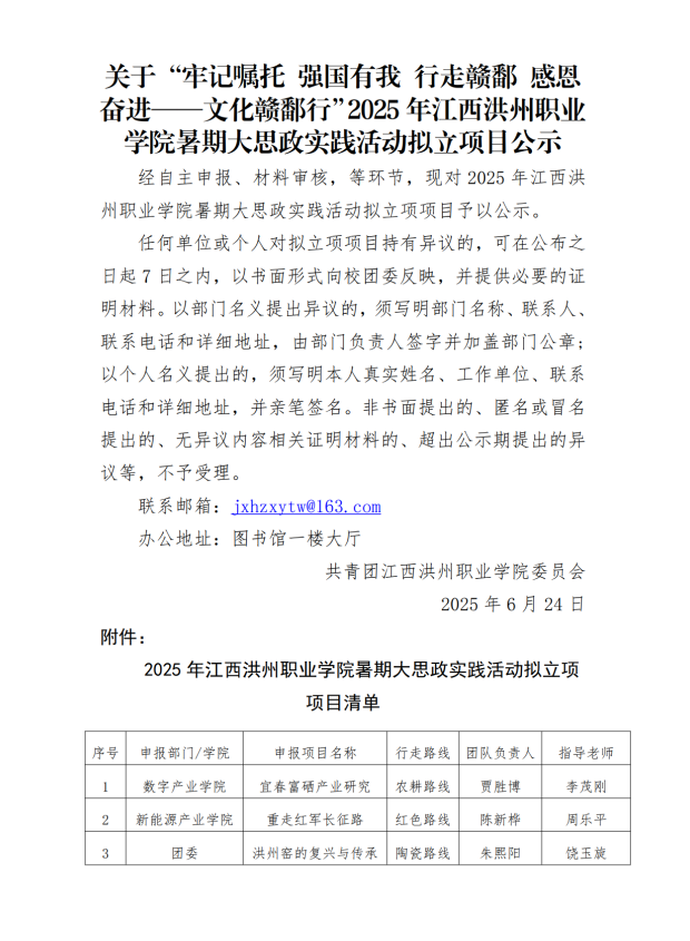 首页栏目 团学动态 一站式服务 通知公告 通知公告 当前位置: 首页 > 首页栏目 > 通知公告 > 正文 关于“牢记嘱托 强国有我 行走赣鄱 感恩奋进——文化赣鄱行”2025年江西洪州职业学院暑期大思政实践活动拟立项目公示 时间:2025-06-24 责任编辑:饶玉旋 初审:李昊 二审:饶玉旋 终审:李茂刚 阅读量:412 上一篇:江西省家庭经济困难学生认定申请表 下一篇:关于开展江西洪州职业学院2025年“红色动漫创作大赛”活动的通知
