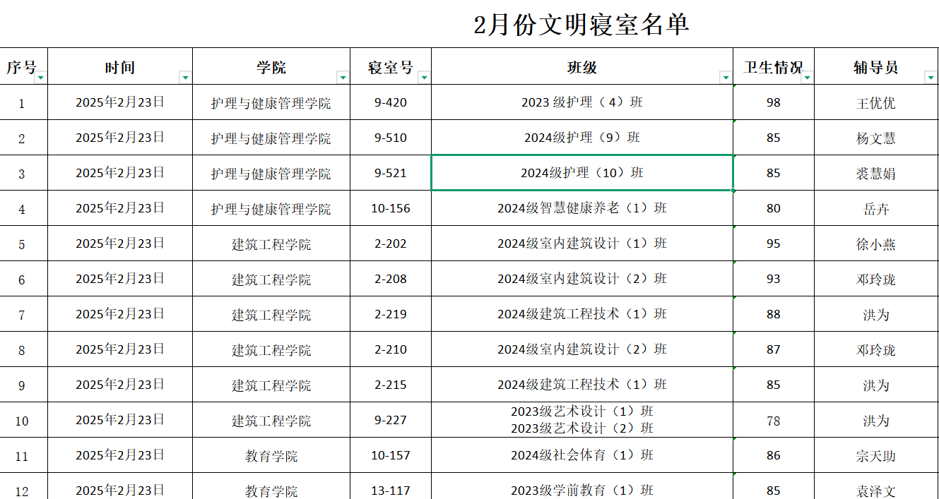 宿舍管理 宿舍管理 当前位置: 首页 > 宿舍管理 > 正文 2025年2月份文明寝室公示 时间:2025-02-24 责任编辑:李普恒 初审:占俊浩 二审:张文斌 终审:易桂林 阅读量:291 为营造整洁、安全、和谐、向上的住宿环境,培养学生良好的生活习惯和集体荣誉感,根据《学生宿舍管理规定》及“文明寝室”评选办法,学工处(或宿舍管理中心)结合日常检查、不定期抽查及综合评议,评选出二月份“文明寝室”名单,现予以公示。 上一篇:三月份文明寝室公示 下一篇:我校召开2025年春季学期宿舍管理工作布置会