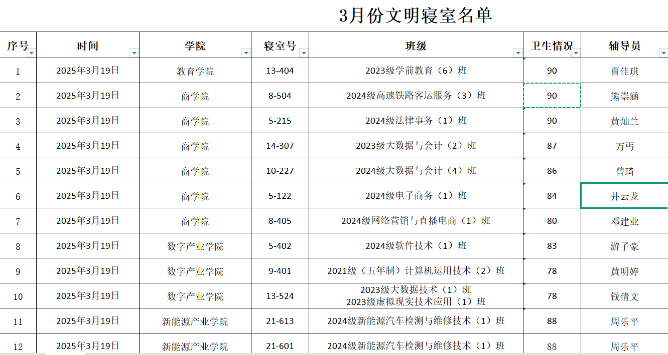 宿舍管理 宿舍管理 当前位置: 首页 > 宿舍管理 > 正文 三月份文明寝室公示 时间:2025-03-24 责任编辑:李普恒 初审:占俊浩 二审:张文斌 终审:易桂林 阅读量:304 为营造整洁、安全、和谐、向上的住宿环境,培养学生良好的生活习惯和集体荣誉感,根据《学生宿舍管理规定》及“文明寝室”评选办法,学工处(或宿舍管理中心)结合日常检查、不定期抽查及综合评议,评选出三月份“文明寝室”名单,现予以公示。 上一篇:四月份文明寝室公示 下一篇:2025年2月份文明寝室公示