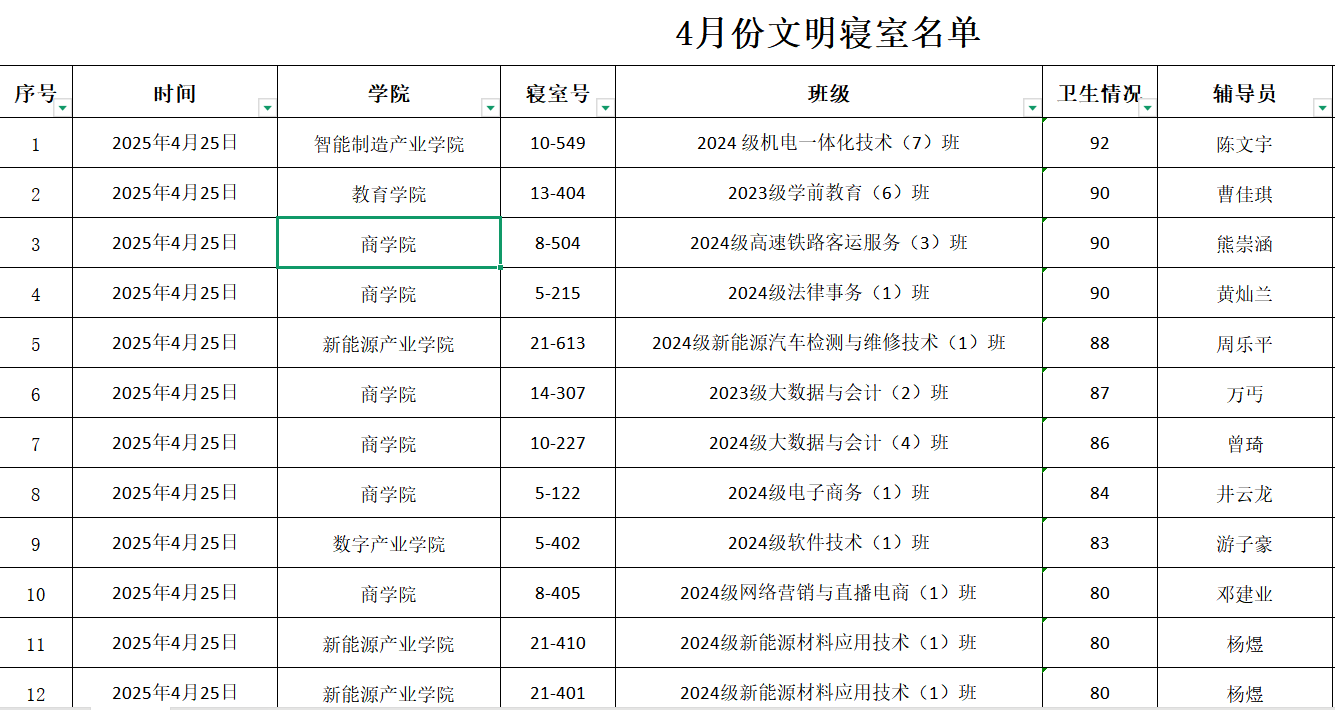 宿舍管理 宿舍管理 当前位置: 首页 > 宿舍管理 > 正文 四月份文明寝室公示 时间:2025-04-28 责任编辑:李普恒 初审:占俊浩 二审:张文斌 终审:易桂林 阅读量:284 为深入推进宿舍文明建设,树立先进典型,促进学生自我管理与社区共建,根据月度评比工作安排,现将四月份“文明寝室”创建活动评选结果公示如下: 上一篇:给宿舍安全“上把锁”——我校开展学生宿舍安全突击检查行动 下一篇:三月份文明寝室公示
