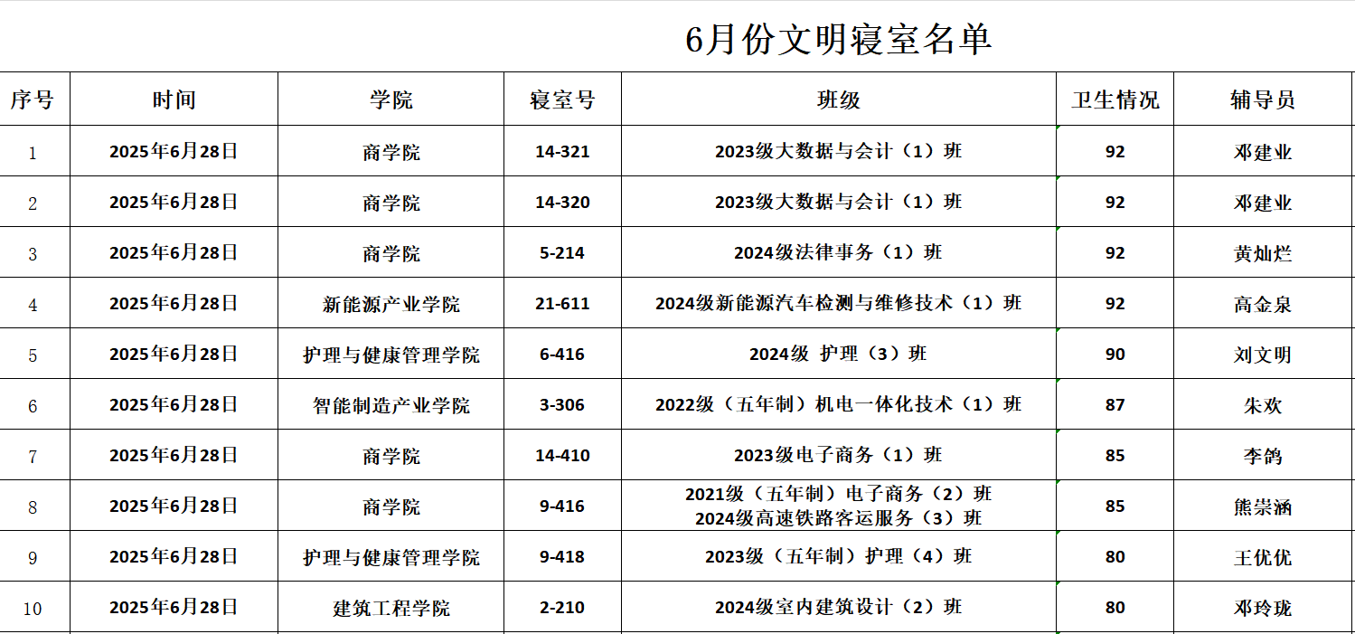 宿舍管理 宿舍管理 当前位置: 首页 > 宿舍管理 > 正文 六月份文明寝室公示 时间:2025-06-30 责任编辑:李普恒 初审:占俊浩 二审:张文斌 终审:易桂林 阅读量:272 为持续营造整洁舒适、安全文明、和谐温馨的宿舍生活环境,激励广大学生养成良好的集体生活习惯,根据学校学生宿舍管理相关办法,学生工作部(处)、后勤服务中心及学生宿舍自我管理委员会联合对全校学生宿舍进行了六月份的定期检查与综合考评。现将评比出的“文明寝室”名单公示如下: 上一篇:九月份文明寝室公示 下一篇:五月份文明寝室公示