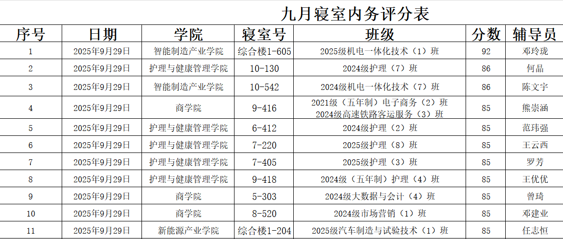 宿舍管理 宿舍管理 当前位置: 首页 > 宿舍管理 > 正文 九月份文明寝室公示 时间:2025-09-30 责任编辑:李普恒 初审:占俊浩 二审:张文斌 终审:易桂林 阅读量:271 为持续营造整洁舒适、安全文明、和谐温馨的宿舍生活环境,激励广大学生养成良好的集体生活习惯,根据学校学生宿舍管理相关办法,学生工作部(处)、后勤服务中心及学生宿舍自我管理委员会联合对全校学生宿舍进行了九合考评。现将评比出的“文明寝室”名单公示如下:月份的定期检查与综 上一篇:十月份文明寝室公示 下一篇:六月份文明寝室公示