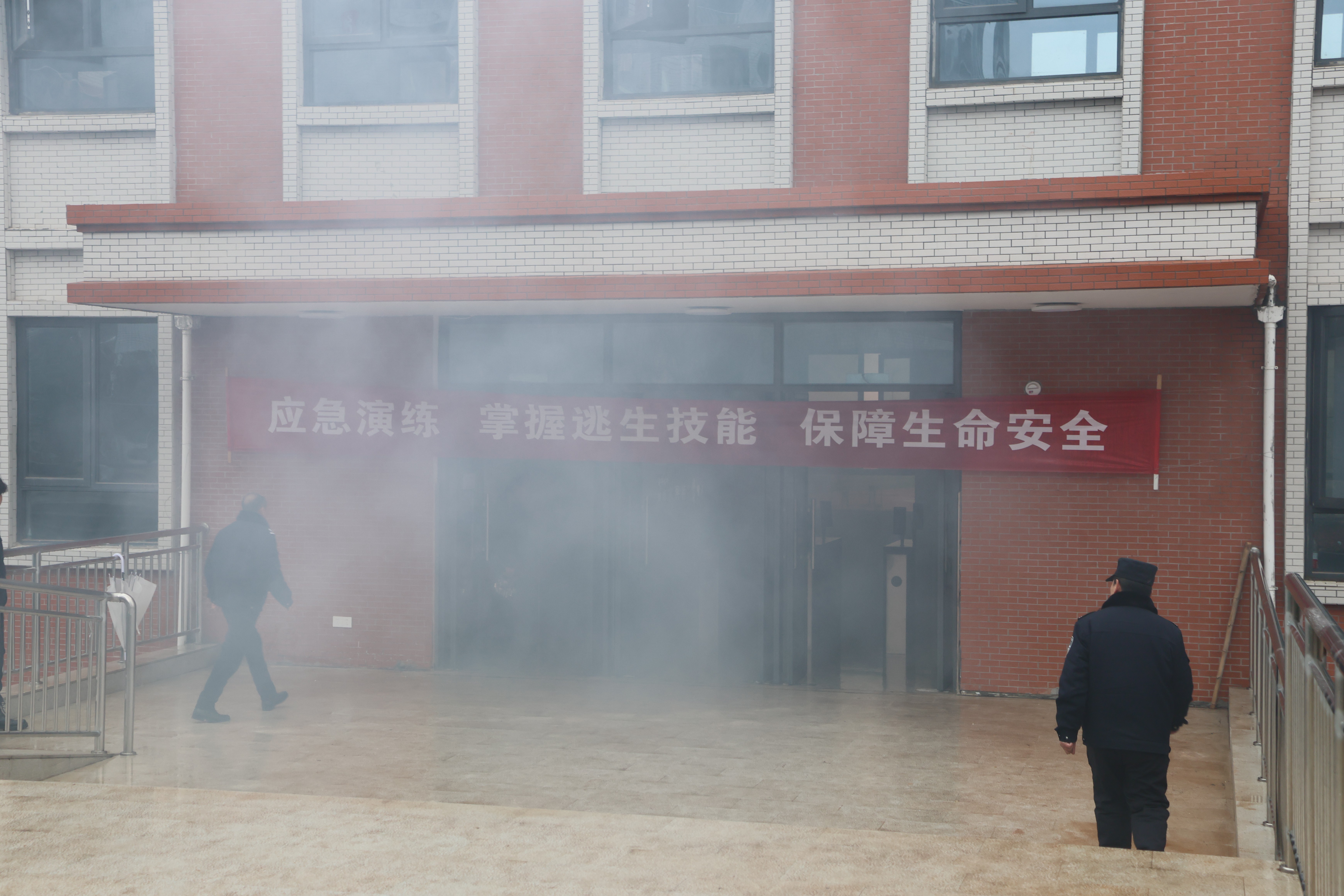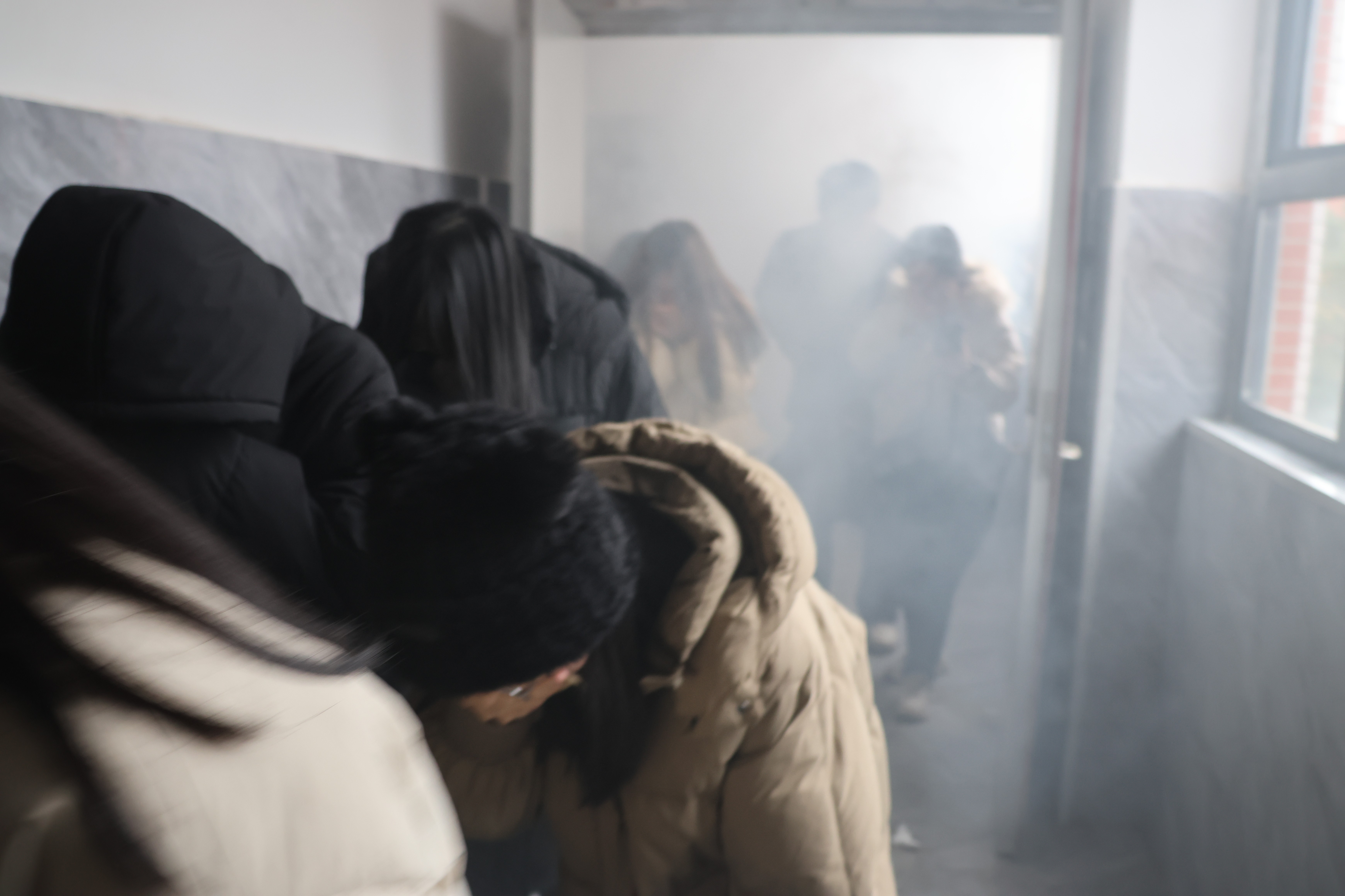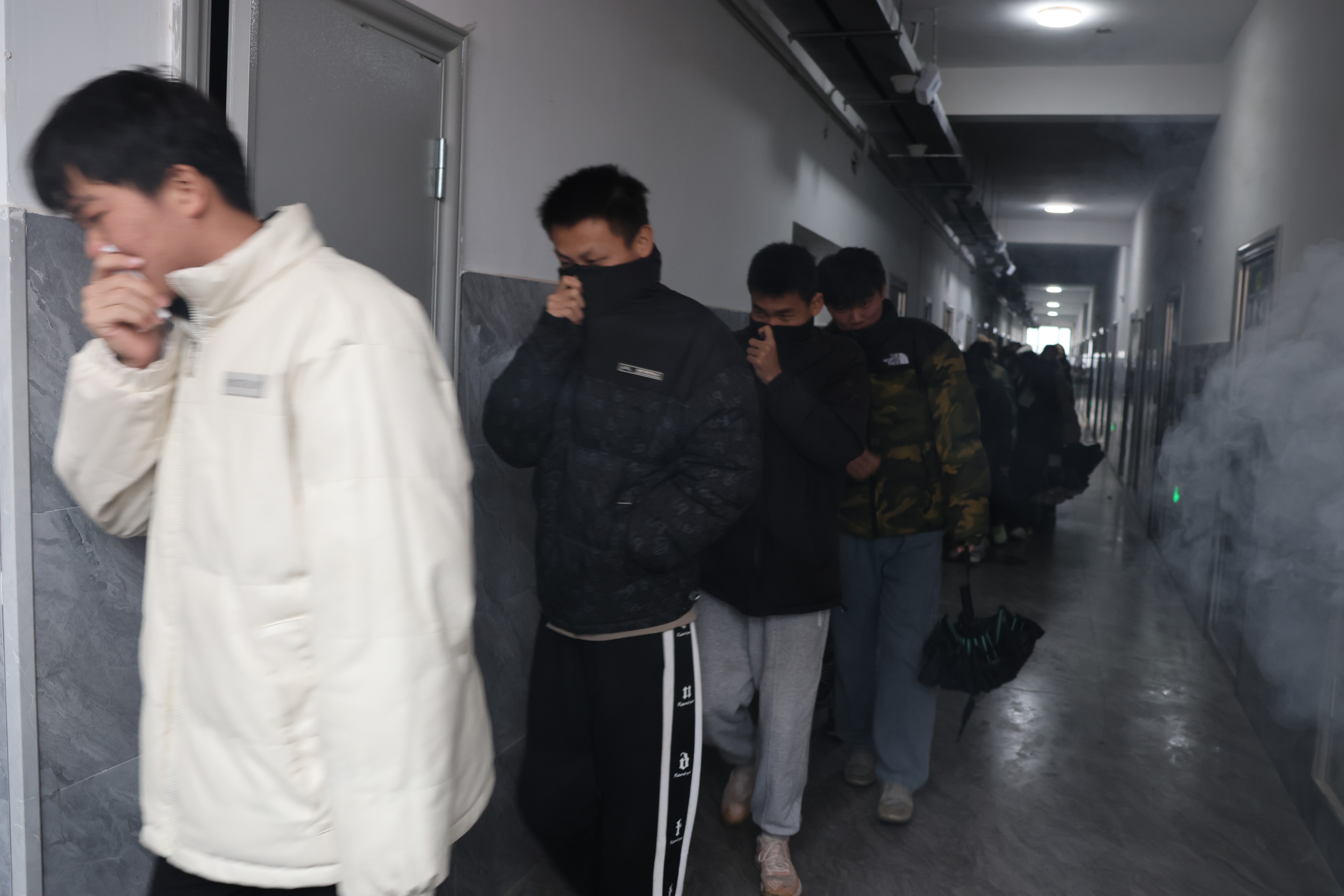 随着烟雾弹的释放和警报声响起,宿舍消防疏散演练正式开始。瞬间楼道里烟雾弥漫,在辅导员和保卫人员的引导下,同学们迅速反应,用手或袖子捂住口鼻,弯腰有序沿安全通道快速撤离到安全地带。疏散结束,同学们到达指定区域后,各学院立即清点人数,确保每位同学安全撤离,无人员遗留事故现场。校长助理周项锦现场指导,并前往“事故”楼层实地查看,对灭火救援设施进行检查,确保消防设施的完好有效。