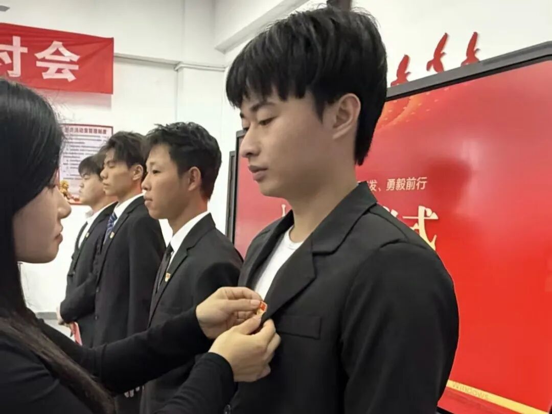 仪式在激昂的《国际歌》中拉开帷幕。学生党支部书记胡琴同志为在场的每一位预备党员郑重佩戴党徽、发放《中国共产党章程》。熠熠生辉的党徽象征着党员的身份与使命,鲜红的党章则是党员践行初心、履行义务的根本遵循。接过党徽与党章的瞬间,新党员们眼神坚定,责任感与使命感在心中油然而生。