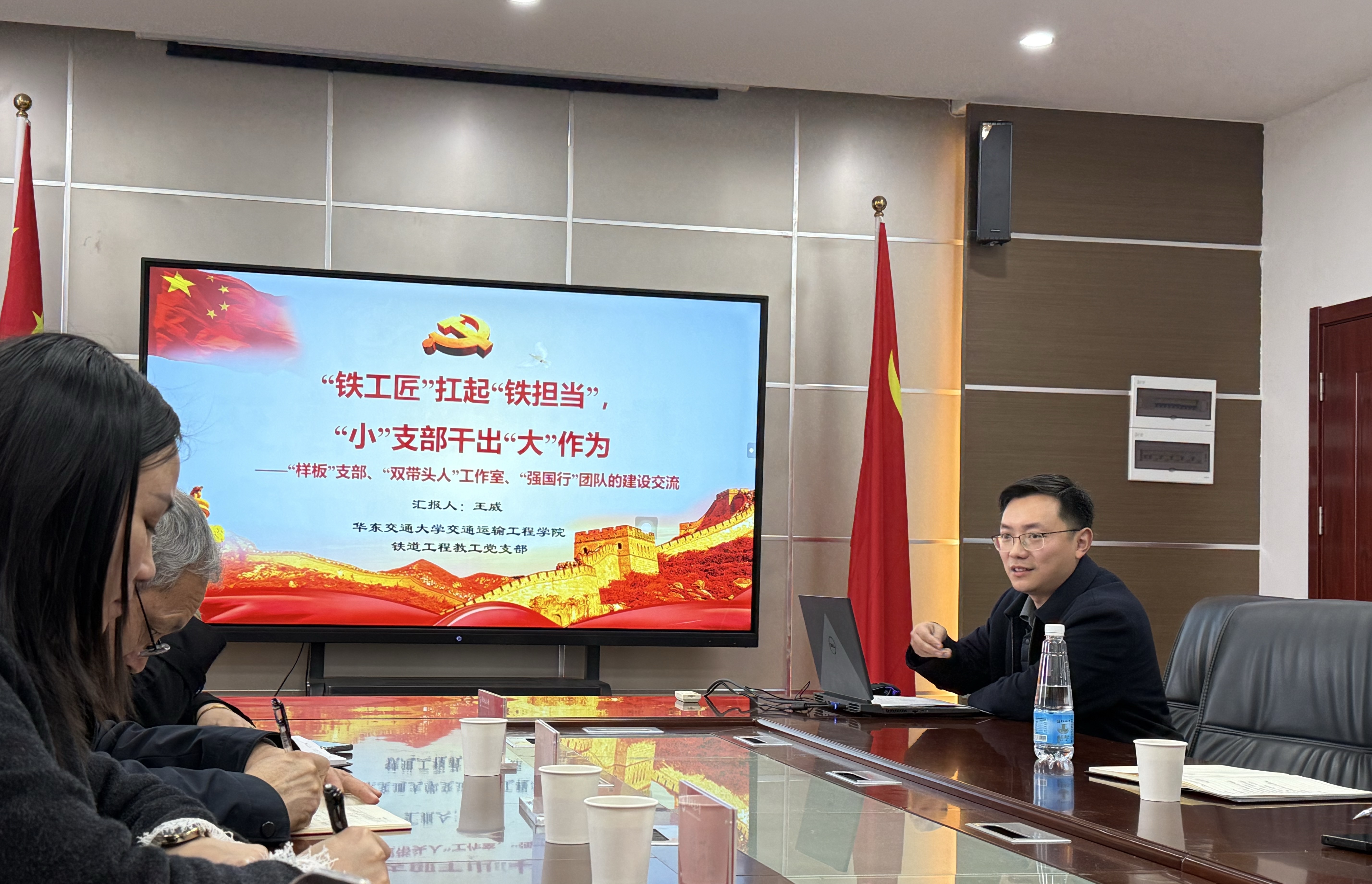 交通运输工程学院铁道工程教工党支部书记王威以PPT形式,全面分享创建过程中的经验做法、难点破解与成果提炼,进行了深入介绍。而后,双方还就支部品牌建设、党员作用发挥、党建活动创新、制度机制建设等方面进行充分交流,进一步明晰创建路径、拓宽工作思路。
