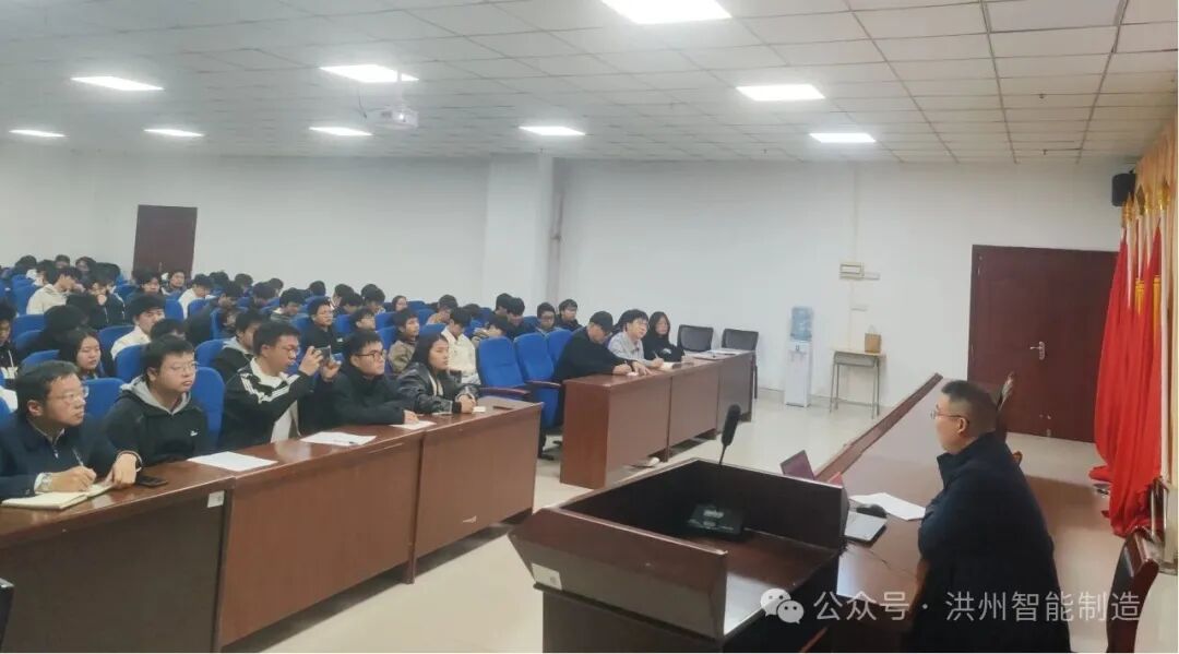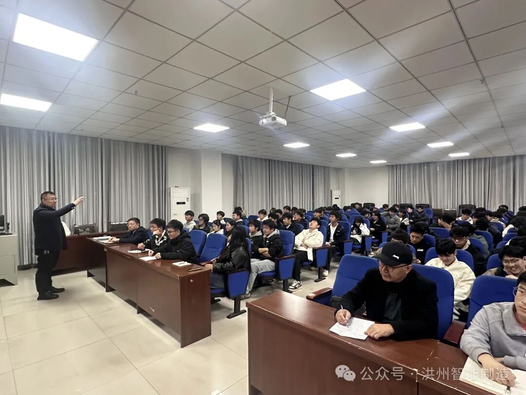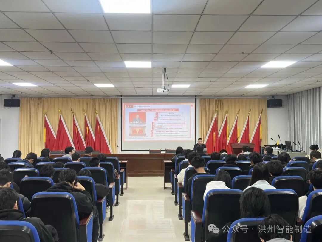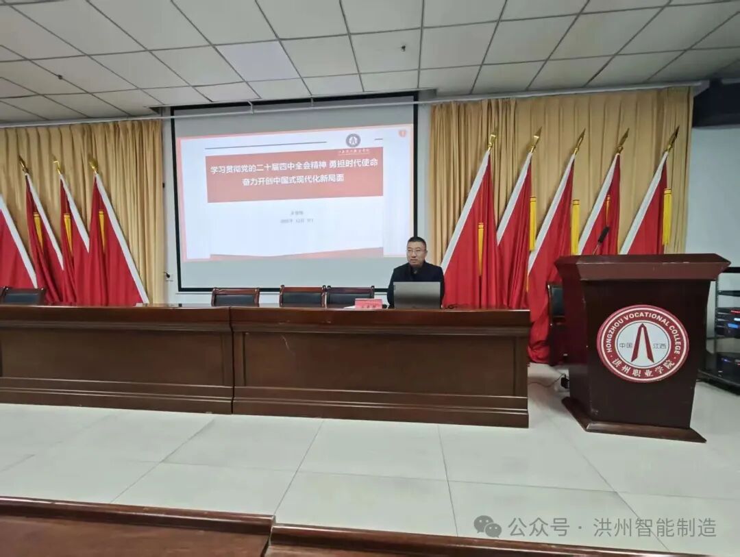 为深入推动党的二十届四中全会精神在基层一线落地生根,切实落实学校《关于学习宣传贯彻党的二十届四中全会精神总体安排的通知》要求,近日,江西洪州职业学院关爱国副校长走进智能制造产业学院,以《深学笃行四中全会精神 培育智能制造时代新人》为题,为学院师生代表作专题宣讲报告。学院领导班子、全体辅导员及学生骨干代表现场聆听学习。