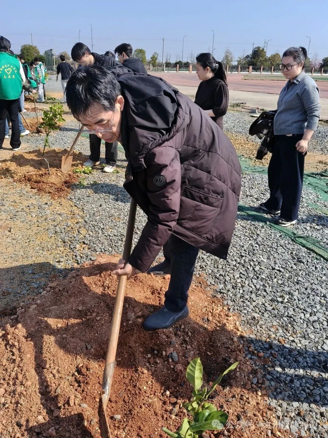 活动现场,师生们一同挥锹铲土、扶苗填坑、踏土夯实、浇水灌溉。大家分工协作、默契配合,现场呈现出一派热火朝天、朝气蓬勃的劳动景象。一棵棵新栽苗木迎风挺立、错落有致,为春日校园增添了盎然生机,也让“绿水青山就是金山银山”的理念在实践中落地生根、入脑入心。