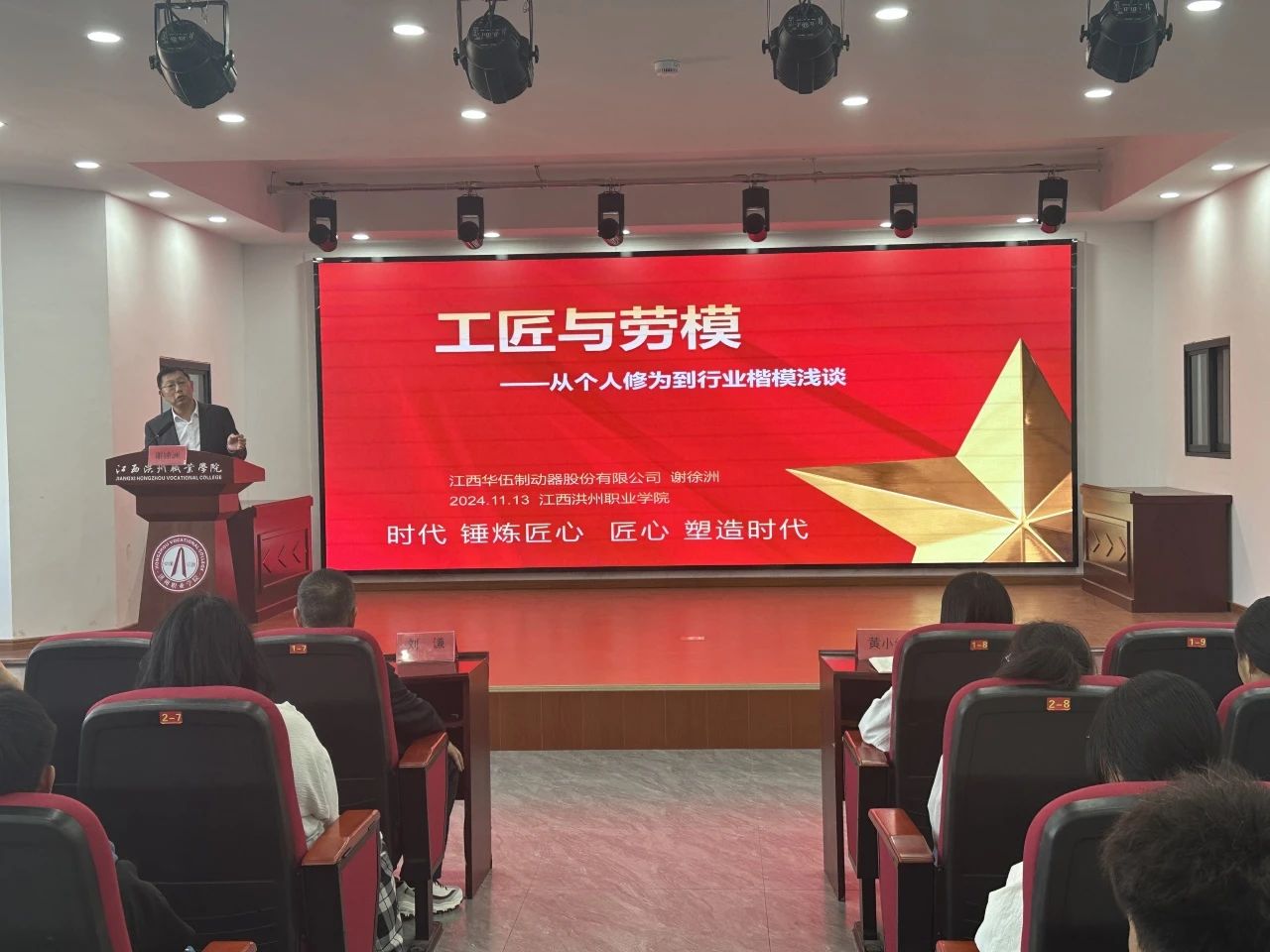 11月13日下午,智能制造产业学院在C505教室隆重举行了“榜样人物进校园”活动。本次活动邀请了杰出榜样人物谢徐洲先生,为在校师生带来了一场精彩纷呈的人生经历与经验分享会。此次活动旨在通过榜样人物的亲身经历,激励同学们积极面对挑战,勇敢追求梦想,为未来的职业生涯打下坚实基础。