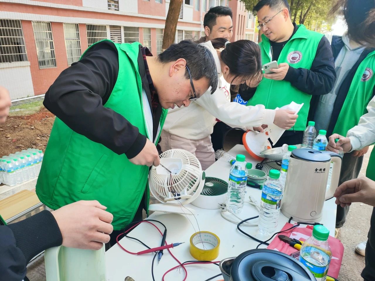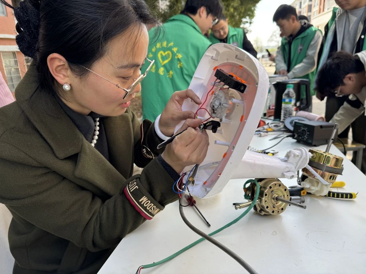 活动现场,师生志愿者们早早布置好维修工作台,携带专业工具投入服务。许多师生带着故障小家电前来求助,体重秤无法显示数据、小风扇转动异常、台灯接触不良……志愿者们耐心询问故障情况,细致排查问题,运用课堂所学的电子电路知识和维修技能,让一件件“罢工”的电器重获新生。