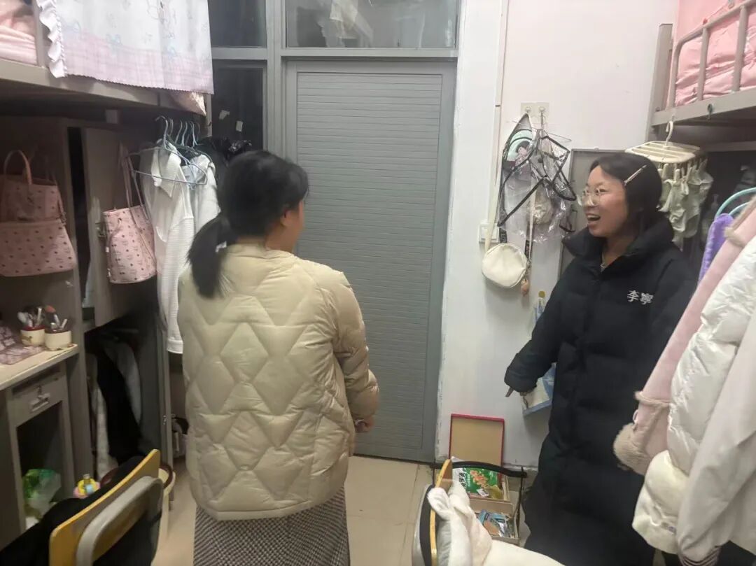 “什么时候到校的?”“假期过得怎么样?”“返校路上还顺利吗?”老师们与同学们亲切交谈,细致询问假期生活、返校情况及学业规划,耐心听取同学们的需求与建议。在传递温暖关怀的同时,老师们也十分关注宿舍的安全与环境状况。走访过程中,大家细心查看宿舍的用电安全、消防设施配备、环境卫生以及基础设施完好情况,一边检查是否存在私拉乱接电线、插座老化等现象,一边耐心向同学们普及安全知识。针对发现的个别卫生死角或潜在隐患,现场提出改进建议,并反复叮嘱:“安全无小事,一定要严格遵守宿舍管理规定,严禁使用违规电器,相互提醒、相互监督,共同守护安全、整洁、温馨的生活环境。”