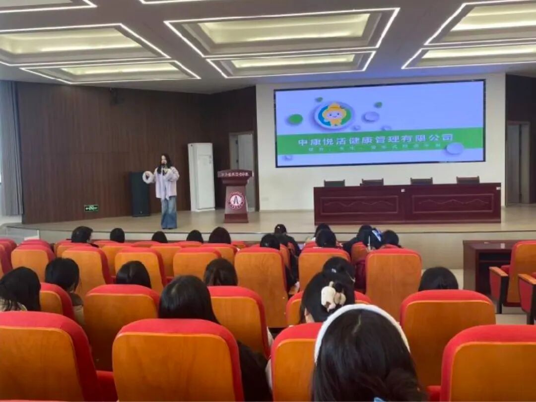 接着,戴佩女士通过PPT向同学们展示了江西中康悦活健康管理有限公司的整体风貌。她简要介绍了公司的发展历程、企业文化、专业服务团队、服务体系及未来展望,并重点说明了为应届生提供的优厚福利待遇——包括完善的五险、超长带薪年假、节日福利、孝爱基金以及新员工导师制等,让同学们对加入中康后的生活保障有了直观了解。为方便后续岗位对接与信息同步,宣讲会现场还建立了中康悦活招聘专属社群。