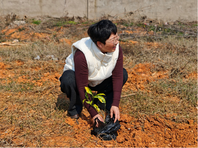 铁锹起落、汗水挥洒,泥土的芬芳与青春的朝气交织在一起。同学们干劲十足,脸上洋溢着劳动的喜悦,用双手种下希望,以行动守护生态。一株株新苗迎风挺立,错落有致,为校园添上了盎然生机,也承载着师生对绿色校园、美丽中国的美好期盼。