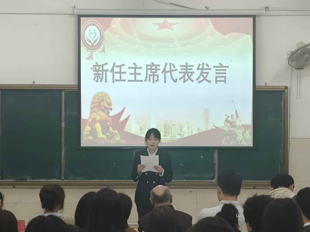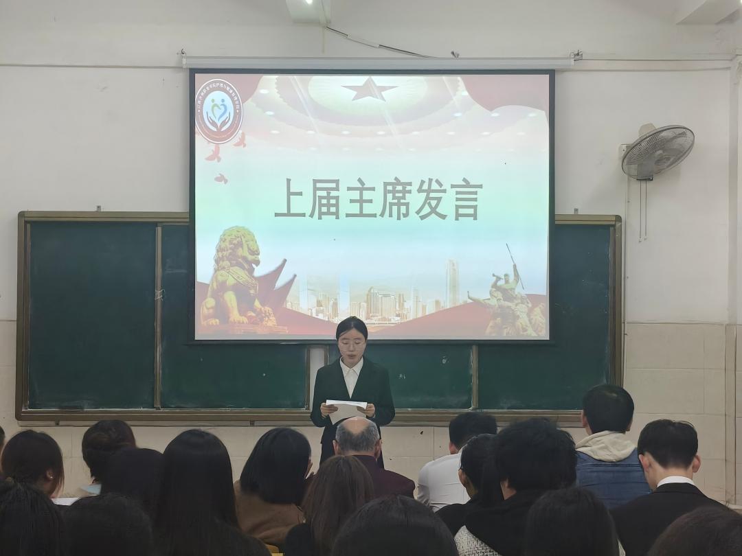 大会伊始,范丁香同学发言。她回顾了学生会工作的经验与成长收获,对学院领导、老师的悉心指导与全体成员的并肩作战致以诚挚感谢,并寄语新一届学生会干部,要坚守服务初心,传承优良作风,以实干担当续写学生会工作新篇章。