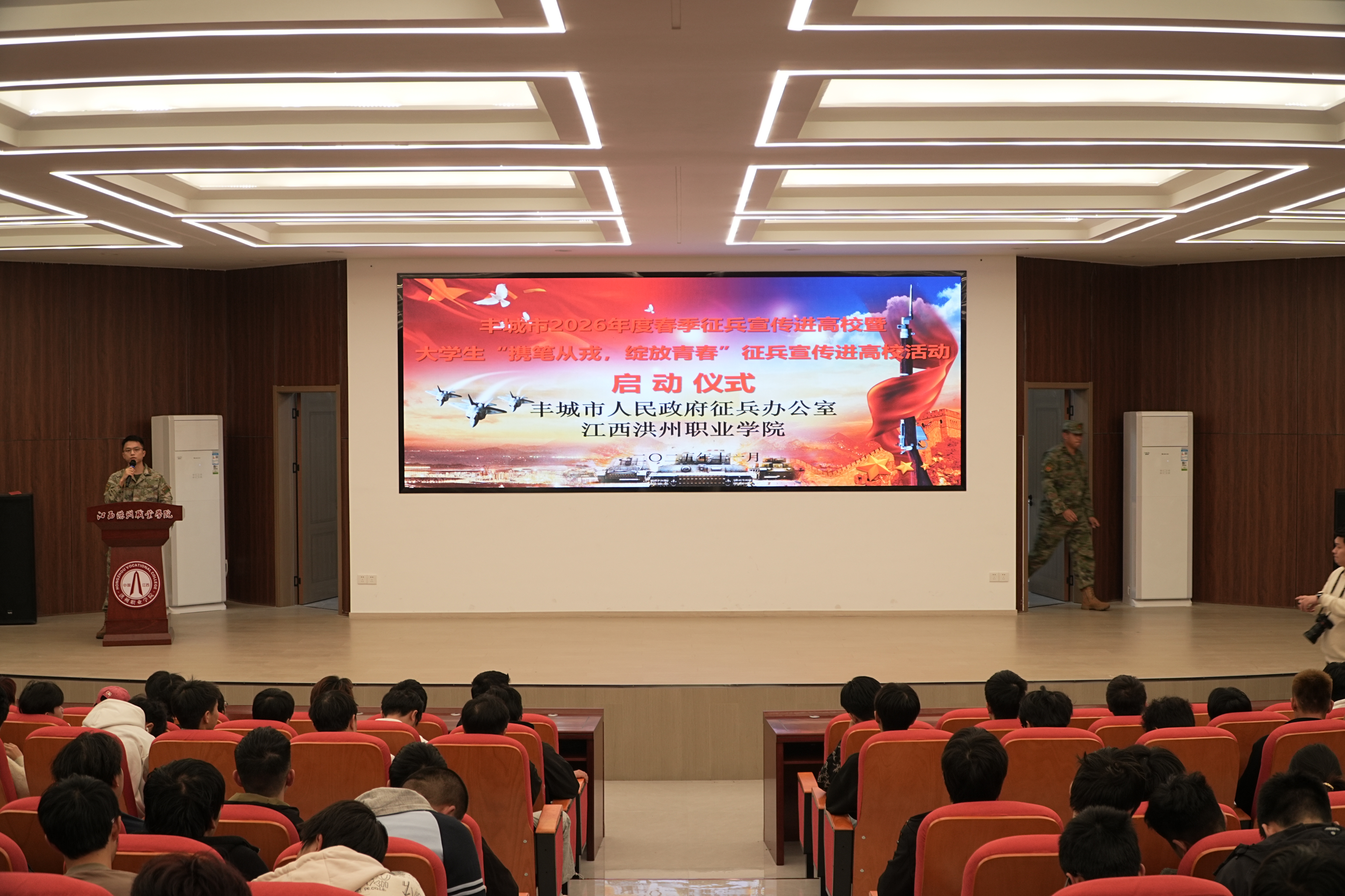 青春风华正茂,参军无上光荣。为进一步强化学生国防观念,激发广大学子参军入伍热情,11月12日晚,学校武装部联合丰城市人民政府征兵办在学校开展2026年度春季征兵宣讲活动,激发广大适龄青年积极投身军营、报效祖国的热情。