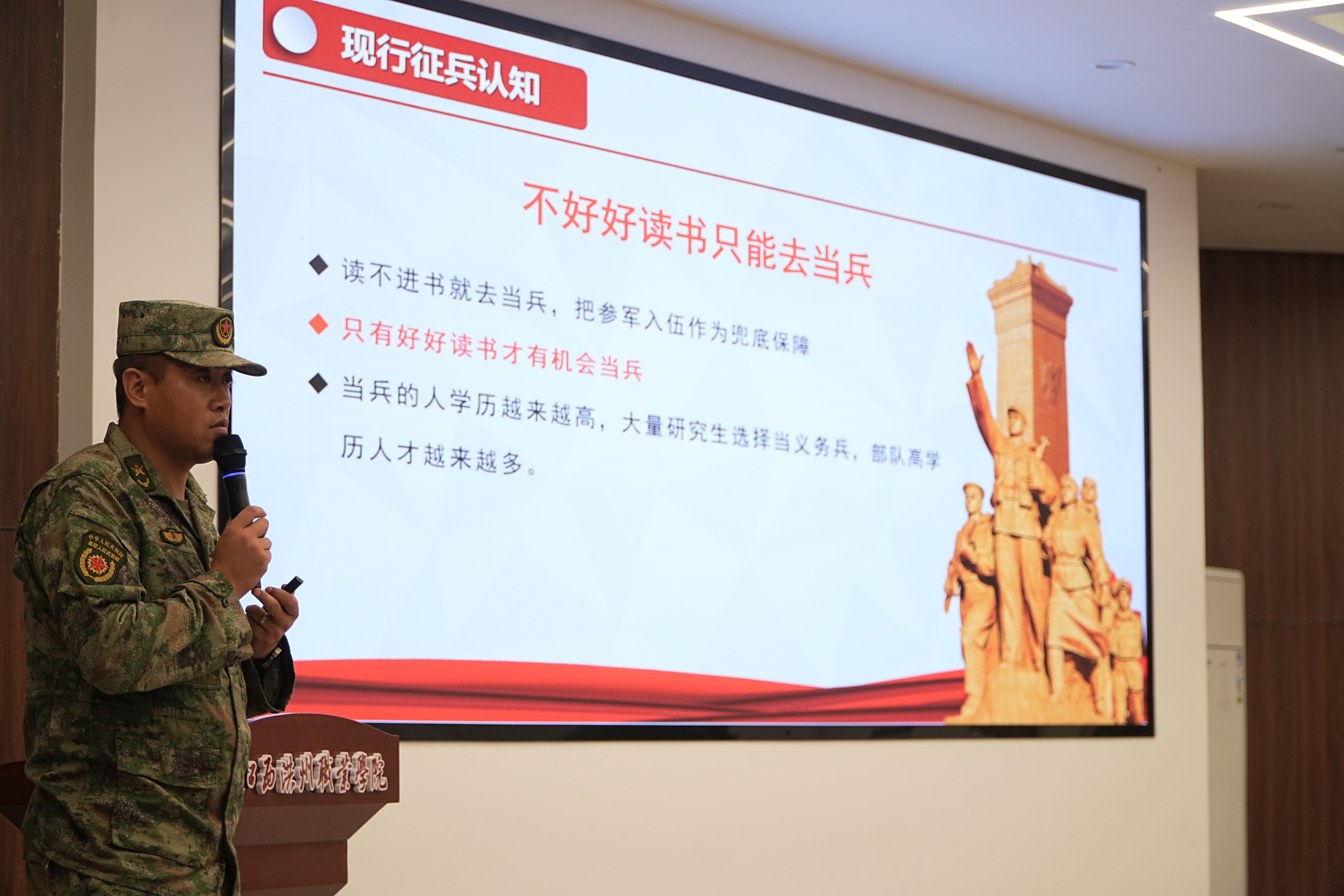 宣讲会现场,退役复学大学生王惠民分享了自己的从军经历和在校学习的所获所感。学校征兵工作站站长毛宁从现行征兵认知、大学生应征入伍条件及程序、大学生体格体检标准及政治考核要求、大学生入伍优待政策四个方面为学生进行了详细解读。