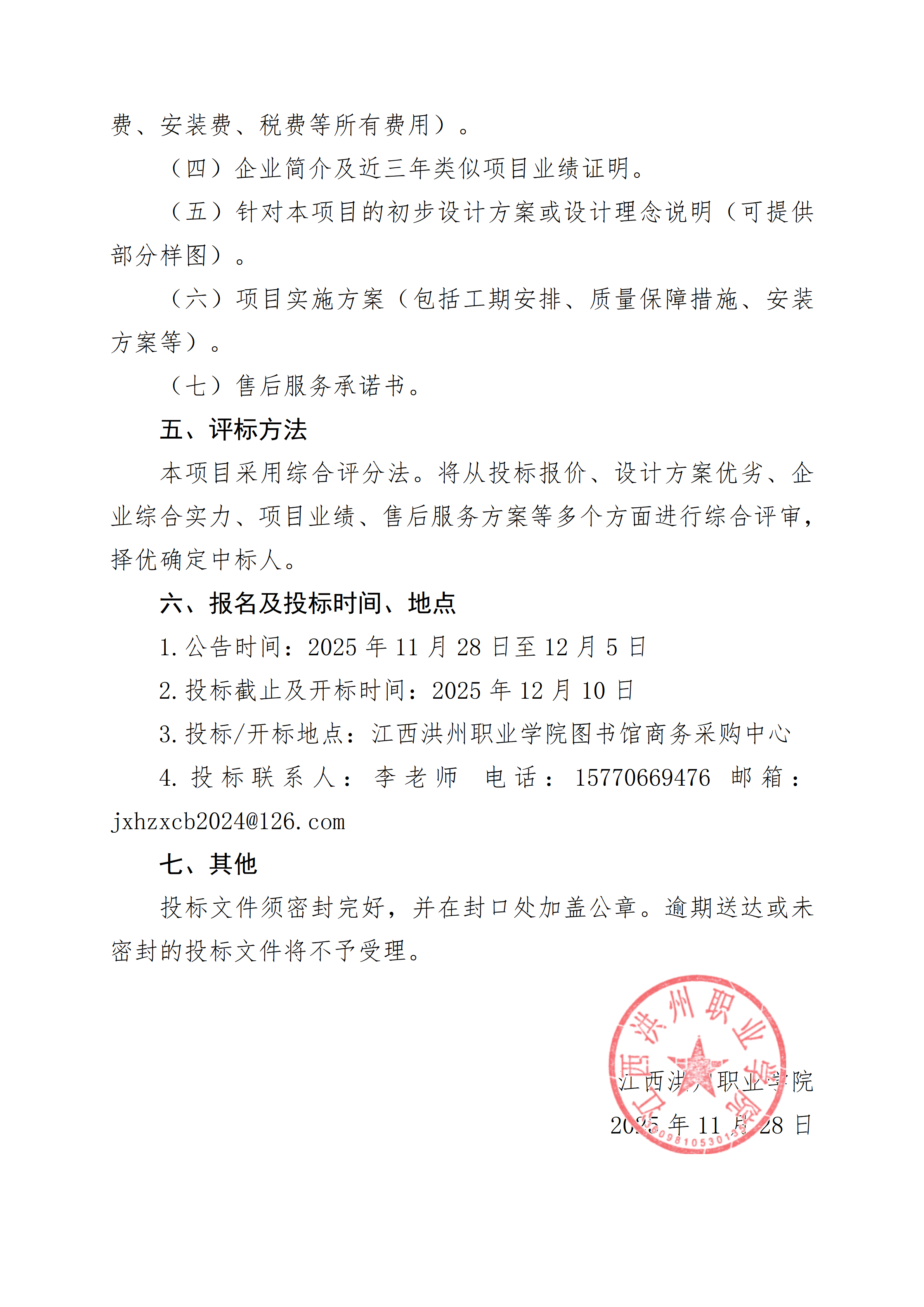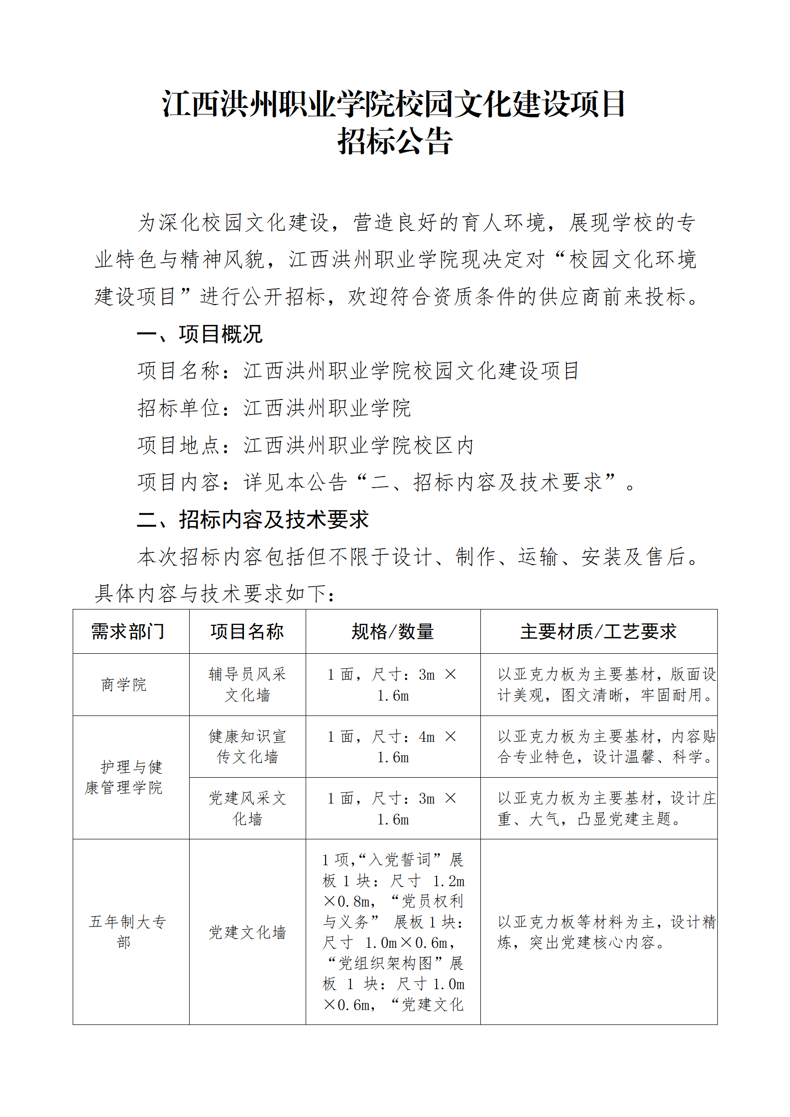 首页栏目 新闻综合 美丽校园 通知公告 下载中心 媒体关注 学校视频 通知公告 当前位置: 首页 > 首页栏目 > 通知公告 > 正文 江西洪州职业学院校园文化建设项目招标公告 时间:2025-11-28 责任编辑:李华丹 初审:李华丹 二审:陈玉清 终审:杨金平 阅读量:115 下一篇:江西洪州职业学院关于校园视觉识别系统(VIS)设计方案的征集公告