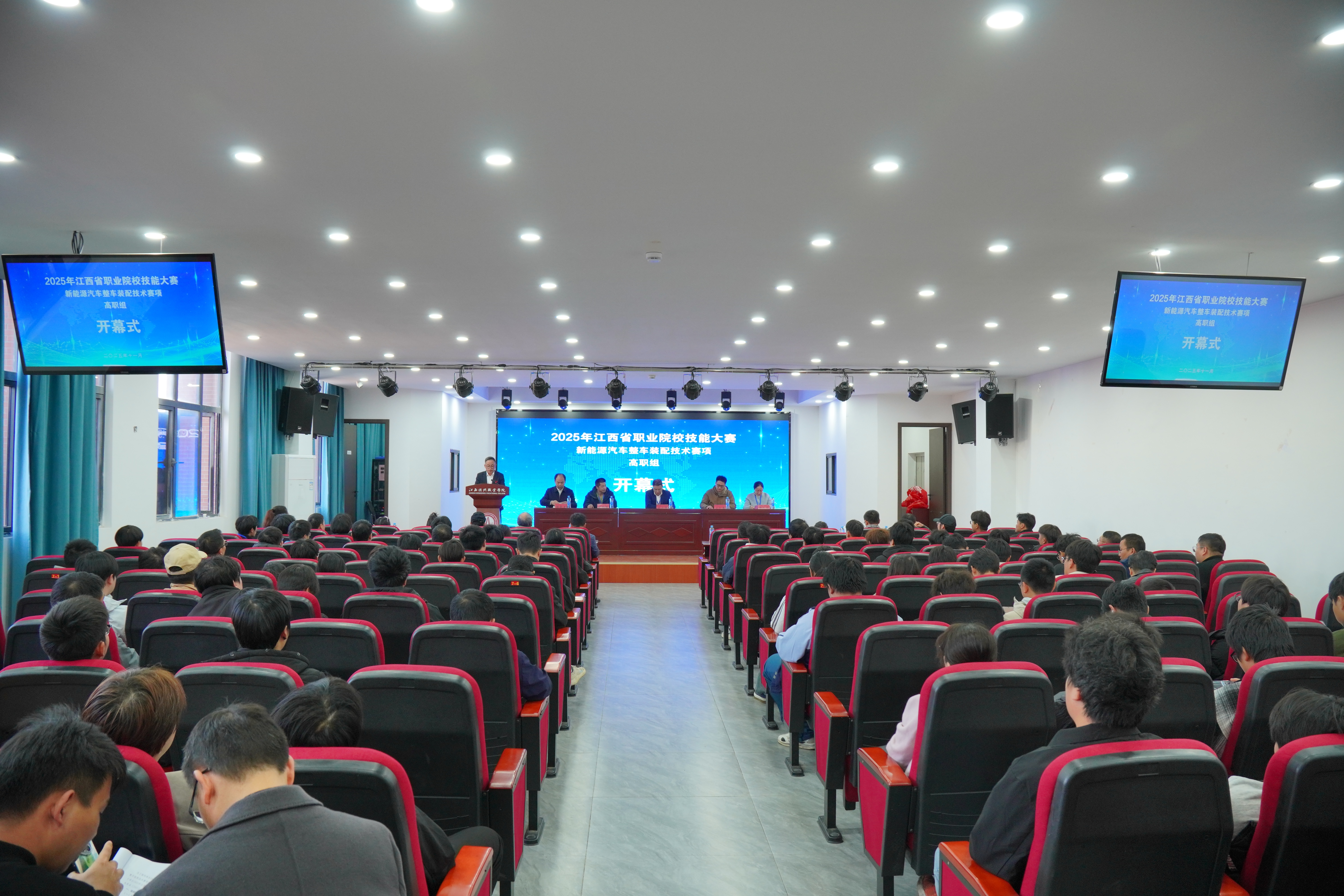初冬暖阳映照奋进之路,技能赛场汇聚逐梦力量。11月28日下午,2025年江西省职业院校技能大赛新能源汽车整车装配技术赛项(高职组)开幕式在江西洪州职业学院隆重举行。来自全省各高职院校的参赛选手、领队老师、指导教师与出席活动的领导嘉宾、裁判组成员、工作人员齐聚一堂,共同见证这一技能竞技盛会的启幕。开幕式由江西洪州职业学院新能源产业学院院长徐昭主持。