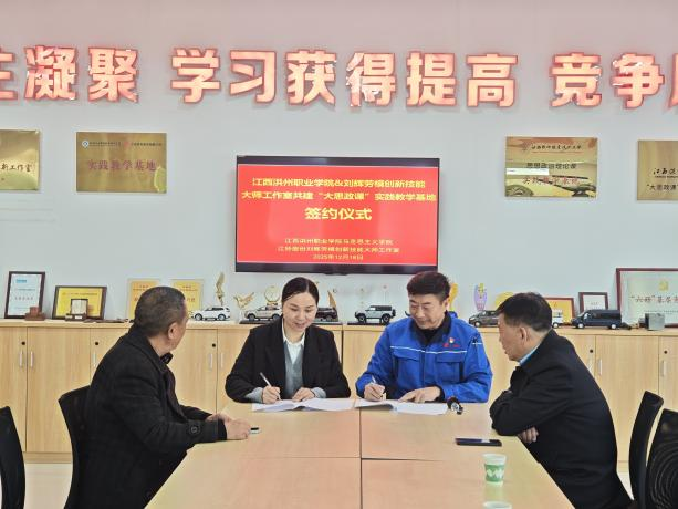 为深入贯彻落实习近平总书记关于“大思政课”的重要指示精神,贯彻落实教育部等十部门印发的《全面推进“大思政课”建设的工作方案》要求,聚焦立德树人根本任务,坚持不懈用习近平新时代中国特色社会主义思想铸魂育人,进一步推动学校思想政治教育创新发展,12月18日上午,江西洪州职业学院与“刘辉劳模创新技能大师工作室”共建“大思政课”实践教学基地签约暨揭牌仪式在刘辉劳模创新技能大师工作室举行。学校党委书记、督导专员梅甜甜,纪委书记熊巧玲,马克思主义学院院长彭庆,工会副主席李国华以及“刘辉劳模创新技能大师工作室”负责人刘辉等参加仪式。