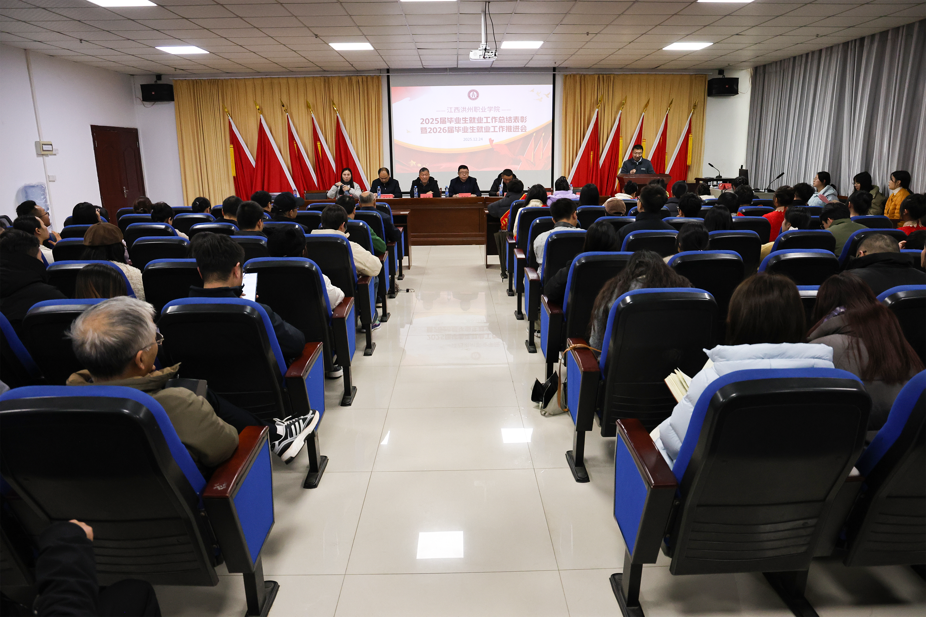 12月24日下午,学校在图书馆一楼学术报告厅隆重召开2025届毕业生就业工作总结表彰暨2026届毕业生就业工作推进会。学校党委书记、督导专员梅甜甜,校长刘权辉,副校长陈剑峰、关爱国、傅箭星、金红艳,纪委书记熊巧玲及各职能部门负责人、各二级学院党政负责人、学工办主任、全体辅导员及就业指导服务中心全体成员参加会议。党委委员、副校长关爱国主持会议。