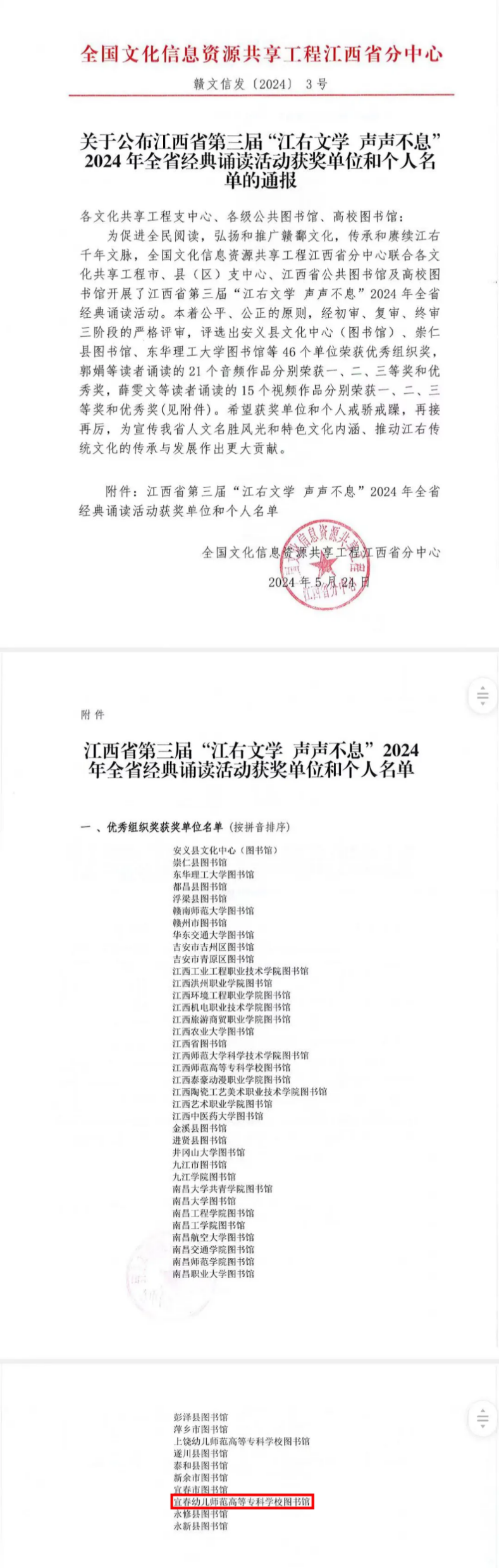 日前,江西省第三届“江右文学 声声不息”2024年全省经典诵读活动公布获奖单位,我校图书馆榜上有名。