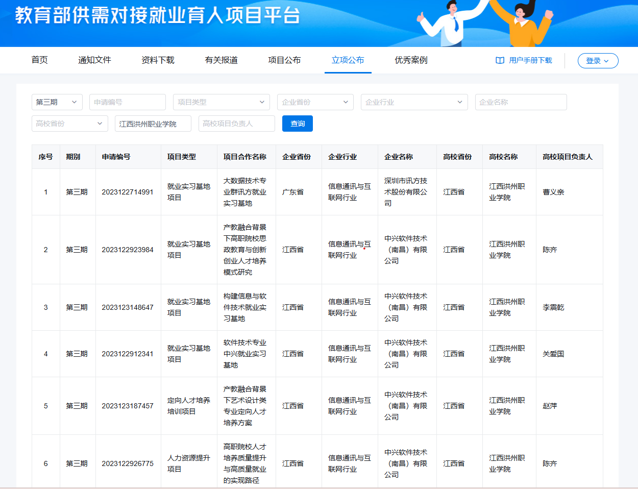 近日,教育部高校学生司(高校毕业生就业服务司)发布《关于公布教育部第三期供需对接就业育人项目立项名单的通知》(教就业司函〔2024〕23号),我校6个项目成功入选教育部“供需对接就业育人项目”名单。其中,就业实习基地项目4个,定向人才培养培训项目1个,人力资源提升项目1个。
