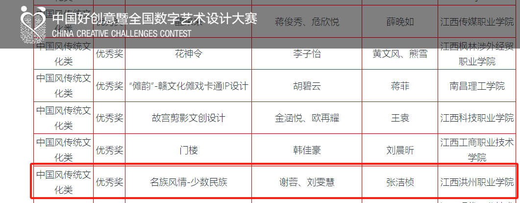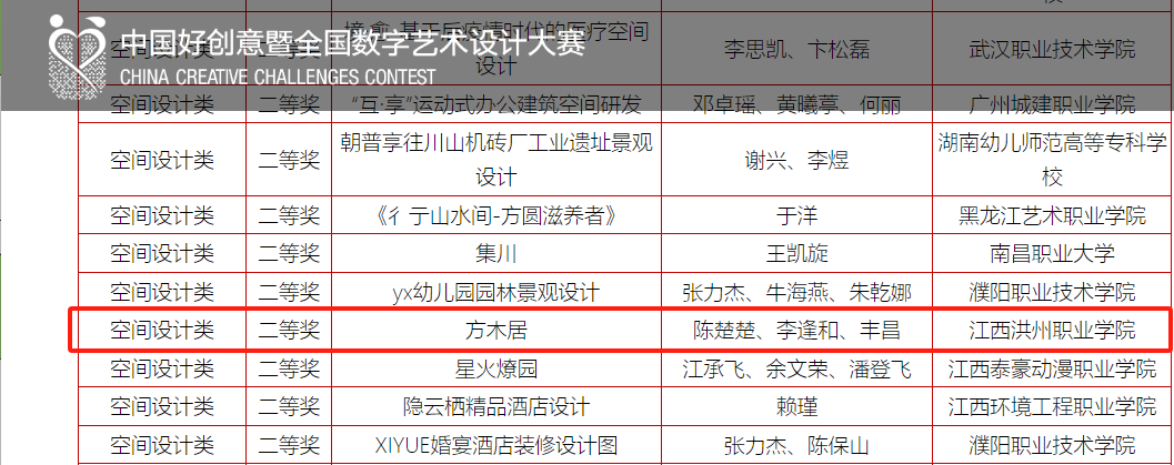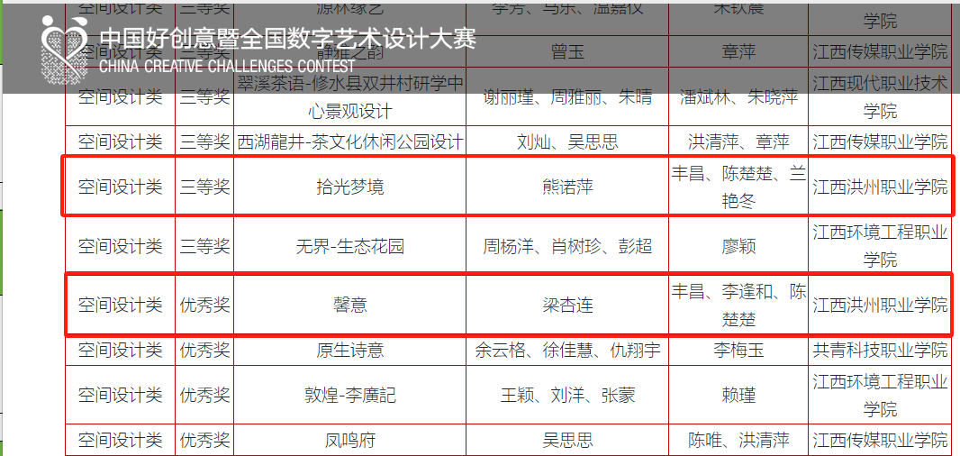 近日,第18届中国好创意暨全国数字艺术设计大赛公示比赛结果。我校建筑工程学院参赛师生凭借扎实的专业技能水平和出色的创新能力,从众多高职院校选手中脱颖而出,喜获佳绩。其中,教师组荣获国赛二等奖1项;学生组获国赛三等奖1项,江西省赛区三等奖1项,优秀奖2项。