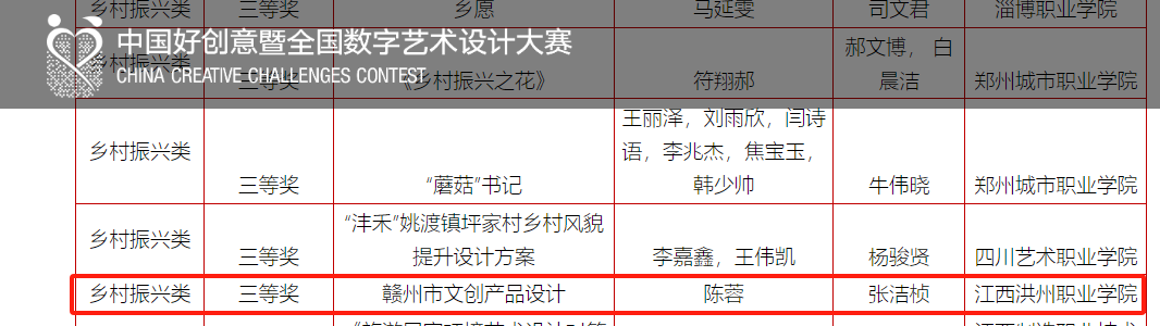 学生陈蓉的作品《赣州市文创产品设计》(指导老师:张洁帧)获国赛(高职赛道)乡村振兴类三等奖
