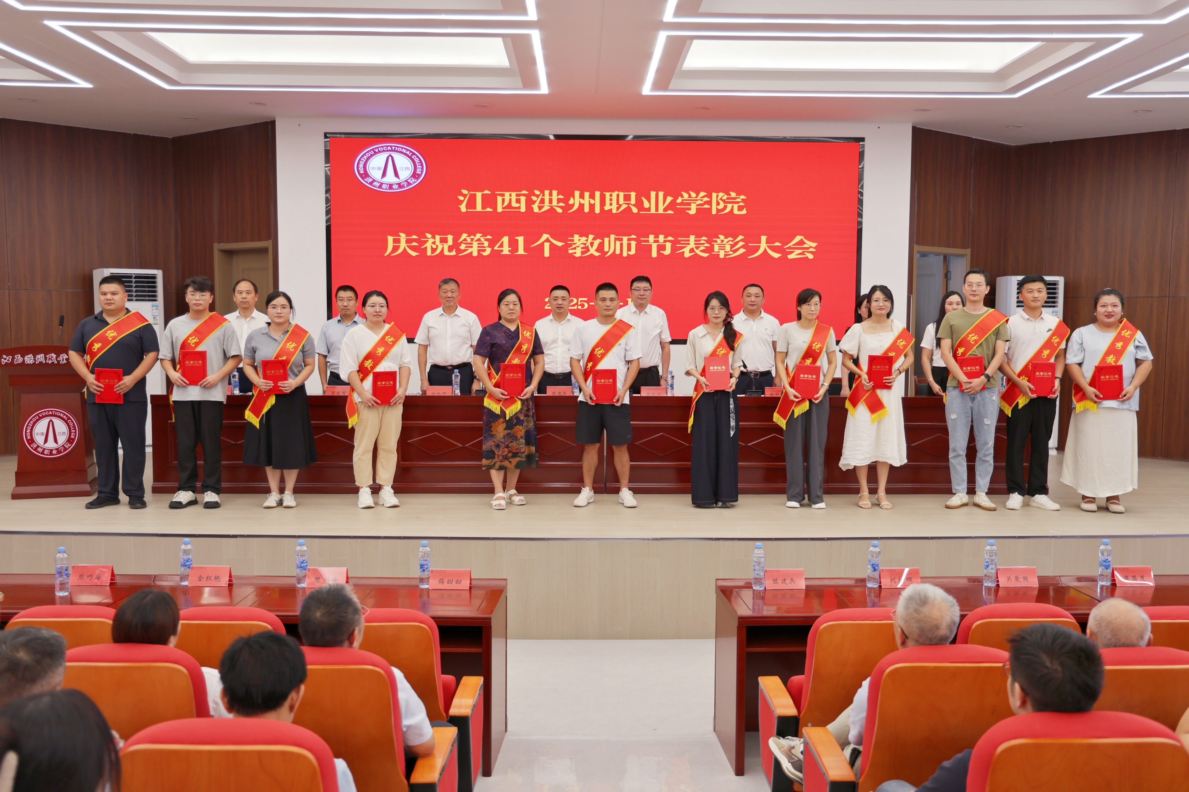 杏坛芬芳,桃李情浓。6号教学楼一楼学术报告厅气氛喜庆、热烈。9月10日下午,学校以“以教育家精神铸魂强师,谱写教育强国建设华章”为主题,隆重举行第41个教师节表彰大会。学校理事长陈建兵,党委书记、督导专员梅甜甜,校长刘权辉,副校长陈剑峰、关爱国、金红艳、傅箭星,纪委书记熊巧玲,与全体教职工齐聚一堂,共庆属于教育工作者的荣光时刻,共话立德树人的初心使命,共谱教育强国新的华章。表彰大会由党委书记梅甜甜主持。